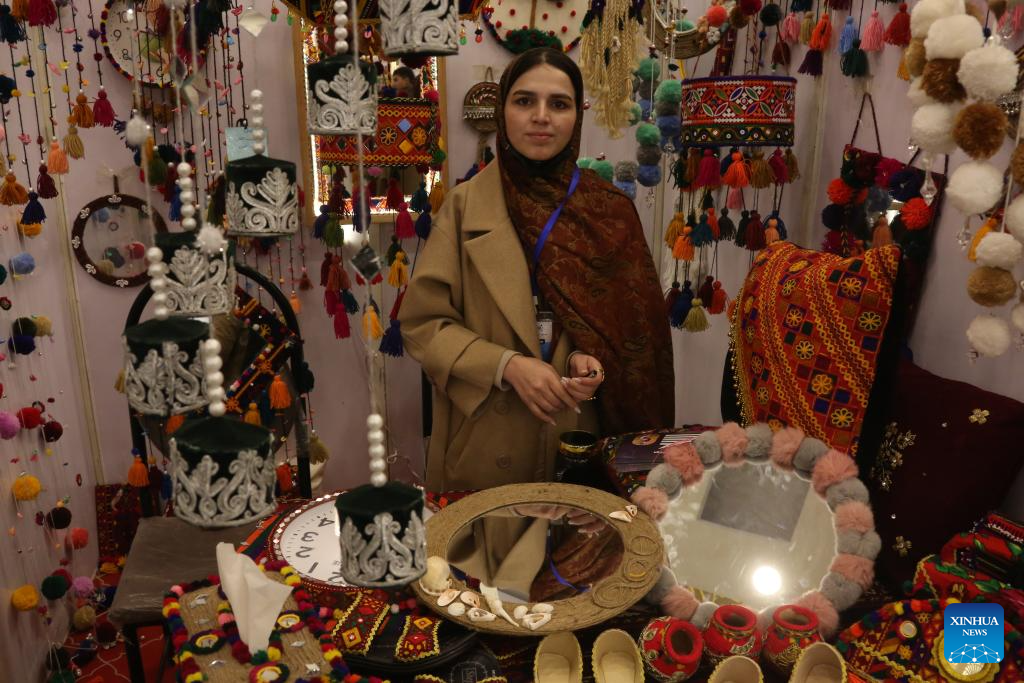 A woman presents home decoration products at an exhibition in Kabul, Afghanistan, Nov. 18, 2025. A week-long industrial and commercial exhibition opened in Kabul, Afghanistan's capital, on Monday, drawing local and foreign companies, the state-run Bakhtar News Agency reported.