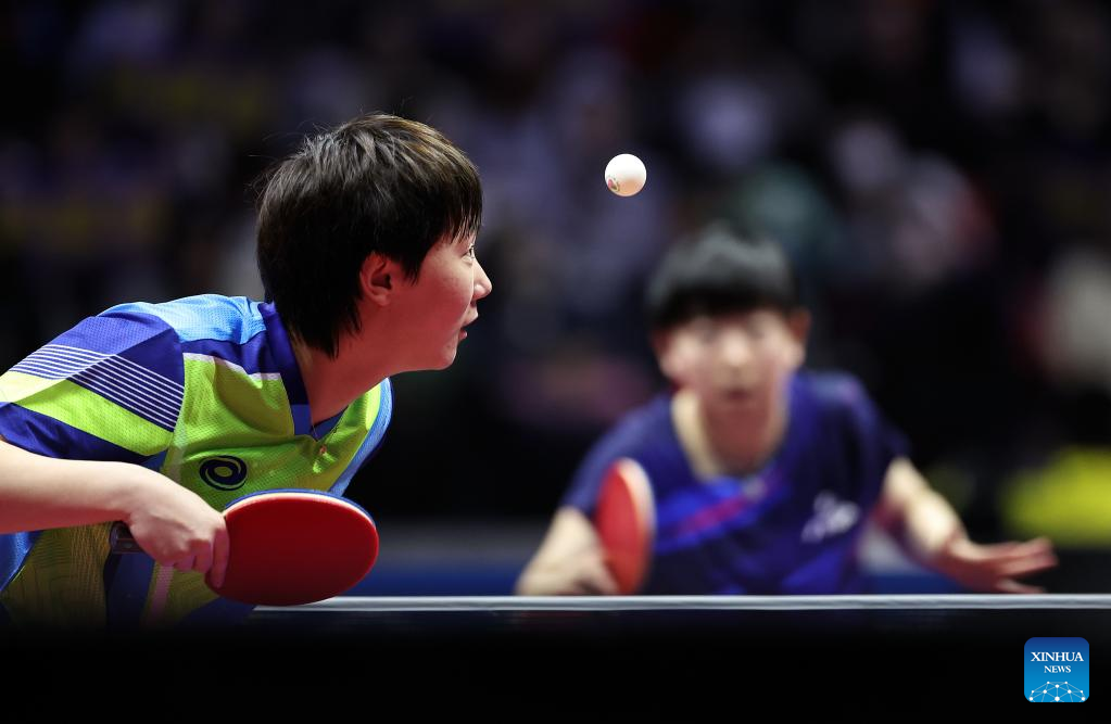 Sun Yingsha (top) hits a return during the women's singles final match of table tennis between Sun Yingsha of Hebei and Wang Manyu of Heilongjiang at China's 15th National Games in Macao, south China, Nov. 16, 2025. (Xinhua/Cheong Kam Ka)