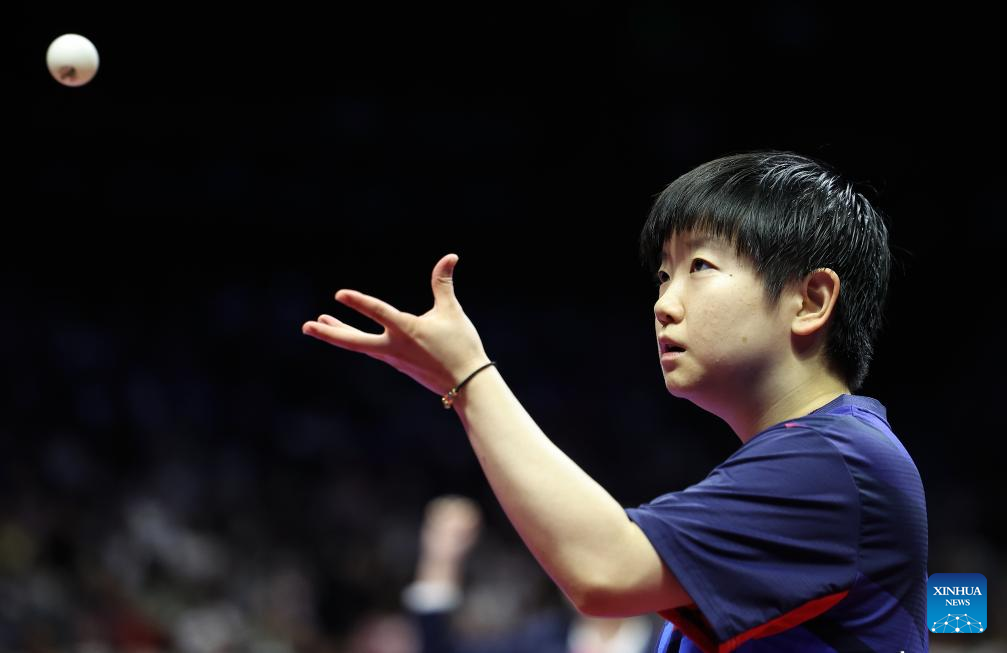 Sun Yingsha is seen during the women's singles final match of table tennis between Sun Yingsha of Hebei and Wang Manyu of Heilongjiang at China's 15th National Games in Macao, south China, Nov. 16, 2025. (Xinhua/Chen Bin)