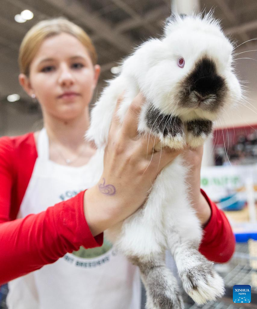 A girl poses for photos with a rabbit during the 2025 rabbit & cavy competition at the Royal Agricultural Winter Fair in Toronto, Canada, Nov. 16, 2025. (Photo by Zou Zheng/Xinhua)