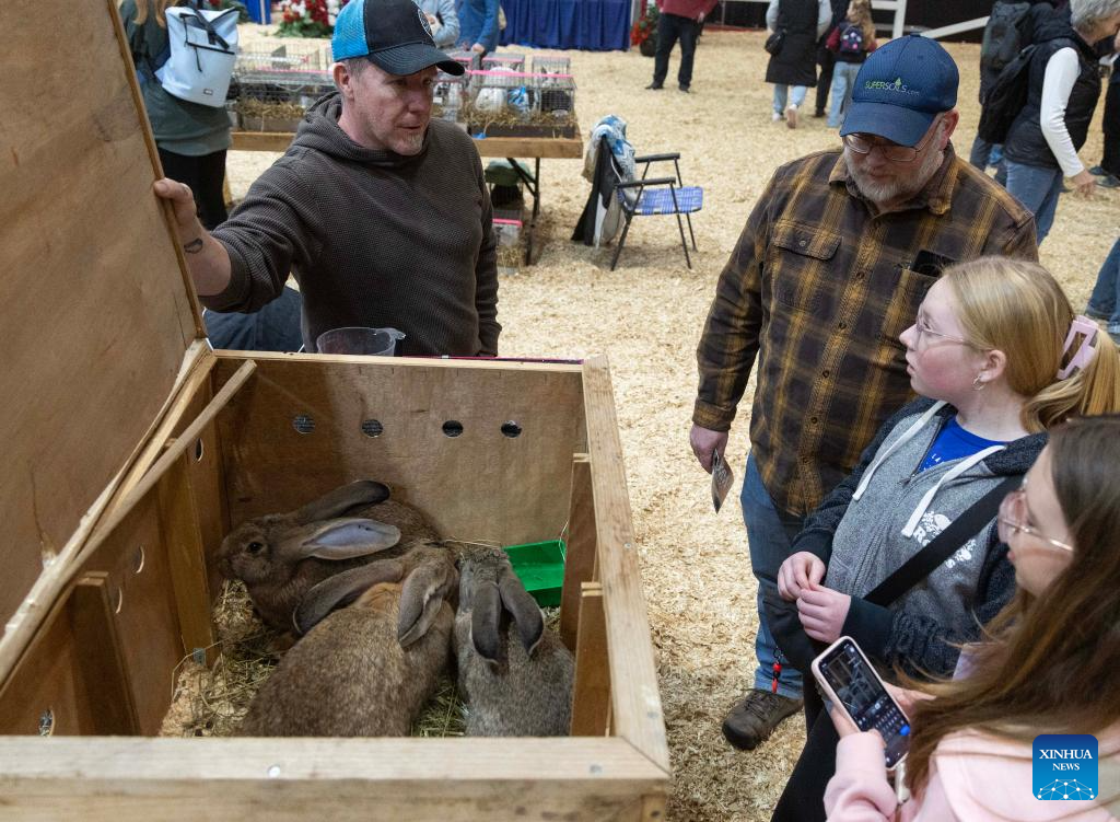 People view rabbits during the 2025 rabbit & cavy competition at the Royal Agricultural Winter Fair in Toronto, Canada, Nov. 16, 2025. (Photo by Zou Zheng/Xinhua)