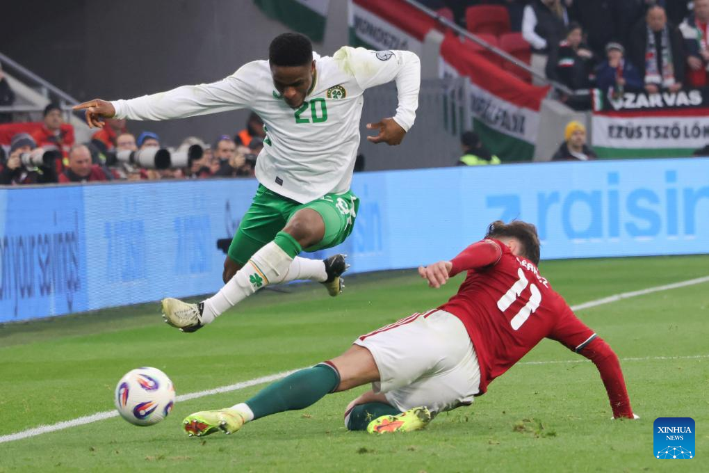 Chiedozie Ogbene (L) of Ireland vies with Attila Szalai of Hungary during the FIFA World Cup 2026 European qualifiers football match between Hungary and Ireland in Budapest, Hungary, on Nov. 16, 2025. (Photo by Attila Volgyi/Xinhua)