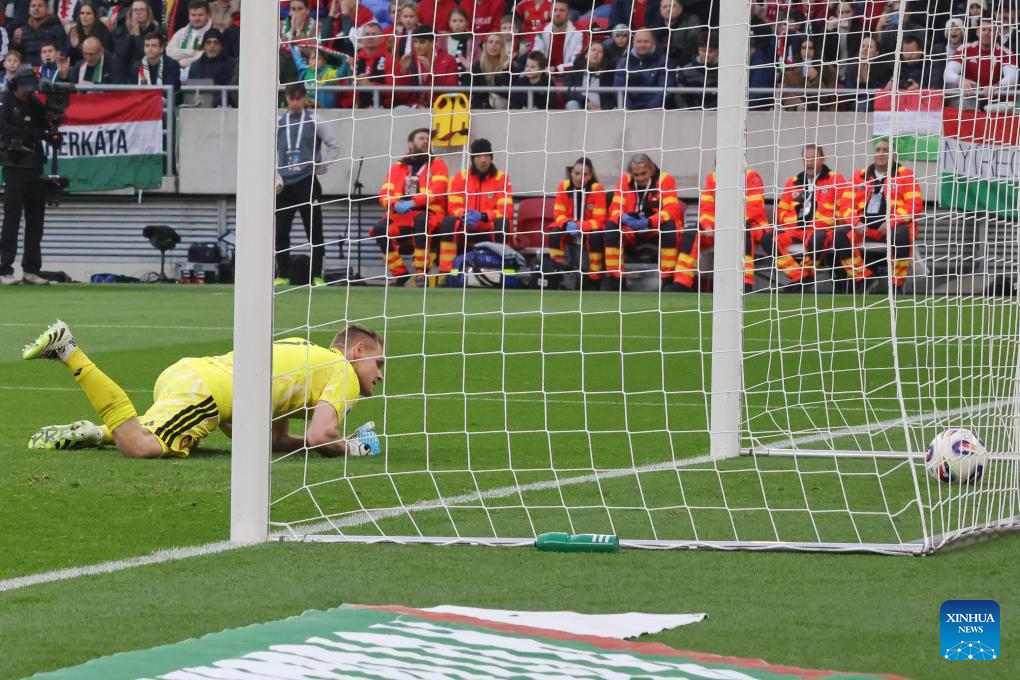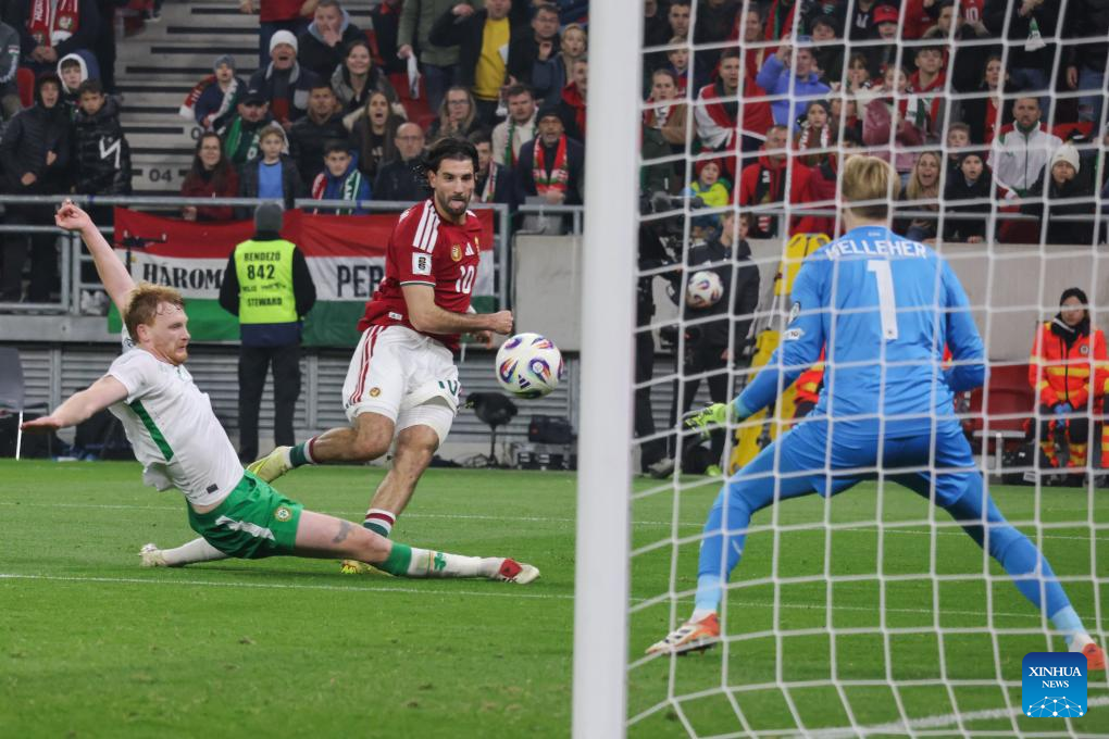 Denes Dibusz, goalkeeper of Hungary, fails to save a goal from Troy Parrott (not pictured) of Ireland during the FIFA World Cup 2026 European qualifiers football match between Hungary and Ireland in Budapest, Hungary, on Nov. 16, 2025. (Photo by Attila Volgyi/Xinhua)