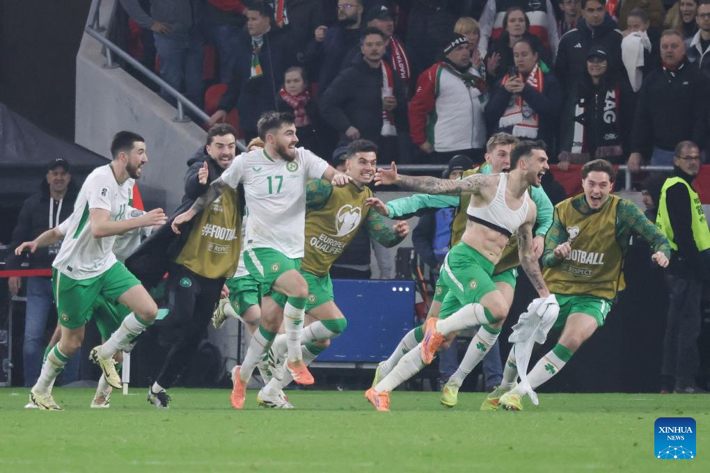 Troy Parrott (2nd R) of Ireland celebrates with teammates after the FIFA World Cup 2026 European qualifiers football match between Hungary and Ireland in Budapest, Hungary, on Nov. 16, 2025. (Photo by Attila Volgyi/Xinhua)