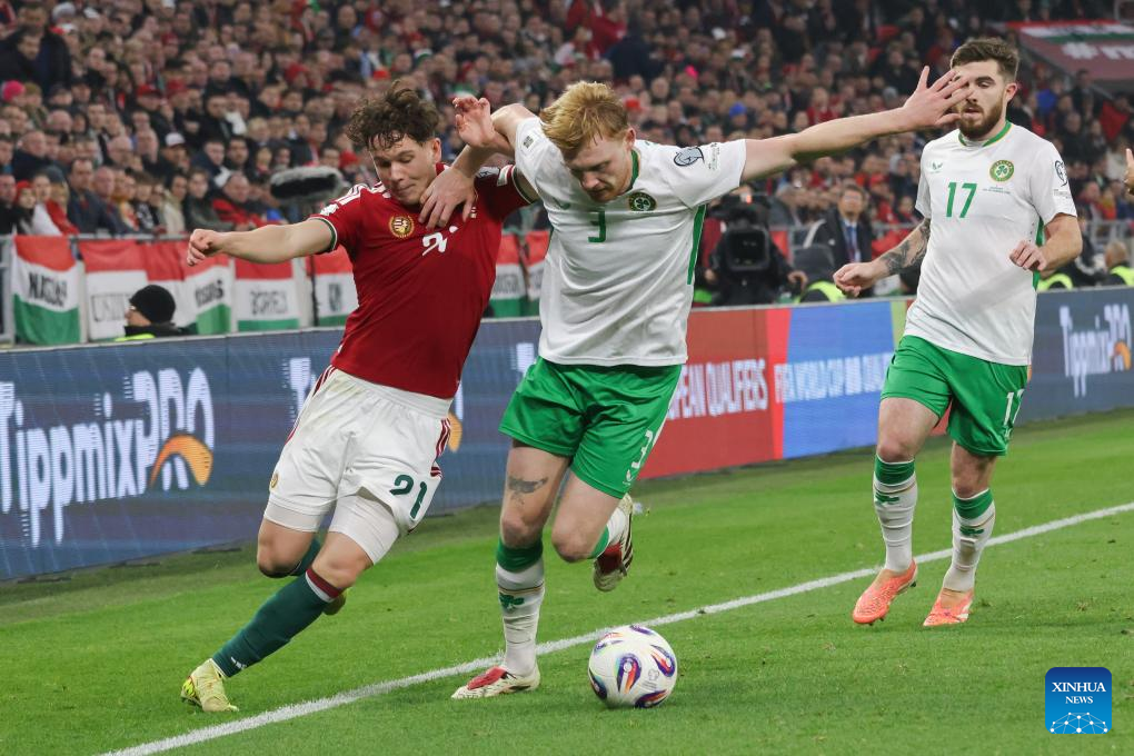 Alex Toth (L) of Hungary vies with Liam Scales (C) of Ireland during the FIFA World Cup 2026 European qualifiers football match between Hungary and Ireland in Budapest, Hungary, on Nov. 16, 2025. (Photo by Attila Volgyi/Xinhua)