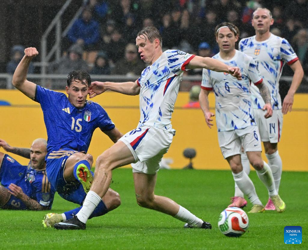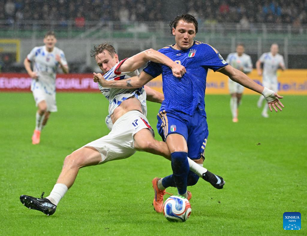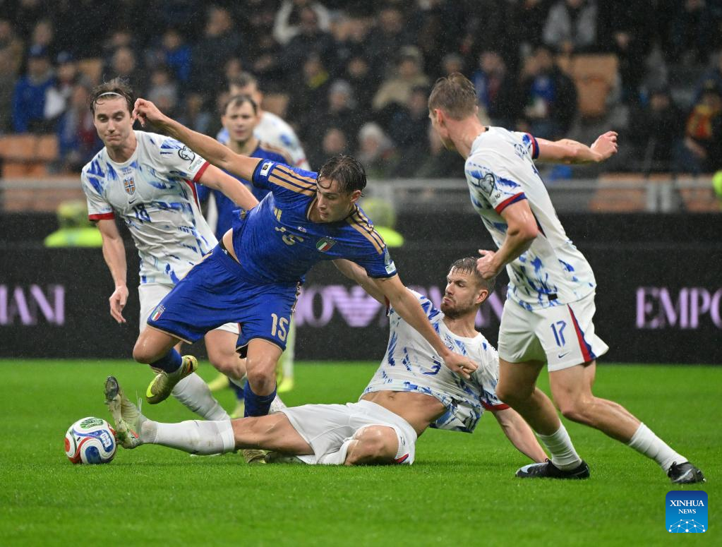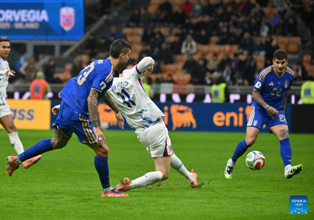 Pio Esposito (2nd L) of Italy vies with Kristoffer Ajer (2nd R) of Norway during the 2026 World Cup European Qualifiers match between Italy and Norway in Milan, Italy, Nov. 16, 2025. (Photo by Alberto Lingria/Xinhua)