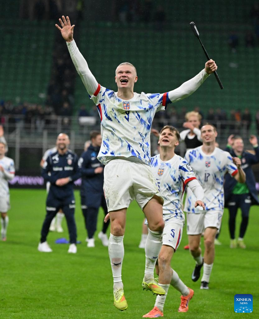 Erling Haaland (front) of Norway celebrates after during the 2026 World Cup European Qualifiers match between Italy and Norway in Milan, Italy, Nov. 16, 2025. (Photo by Alberto Lingria/Xinhua)