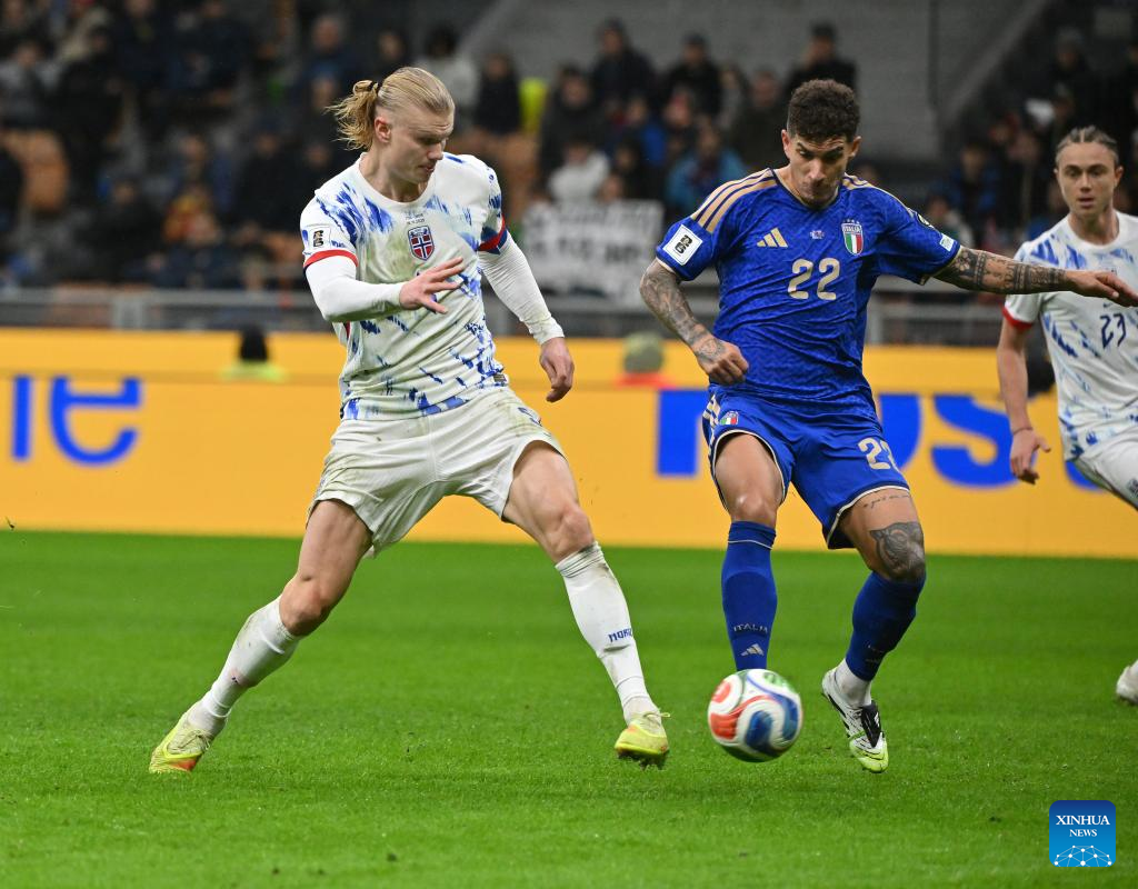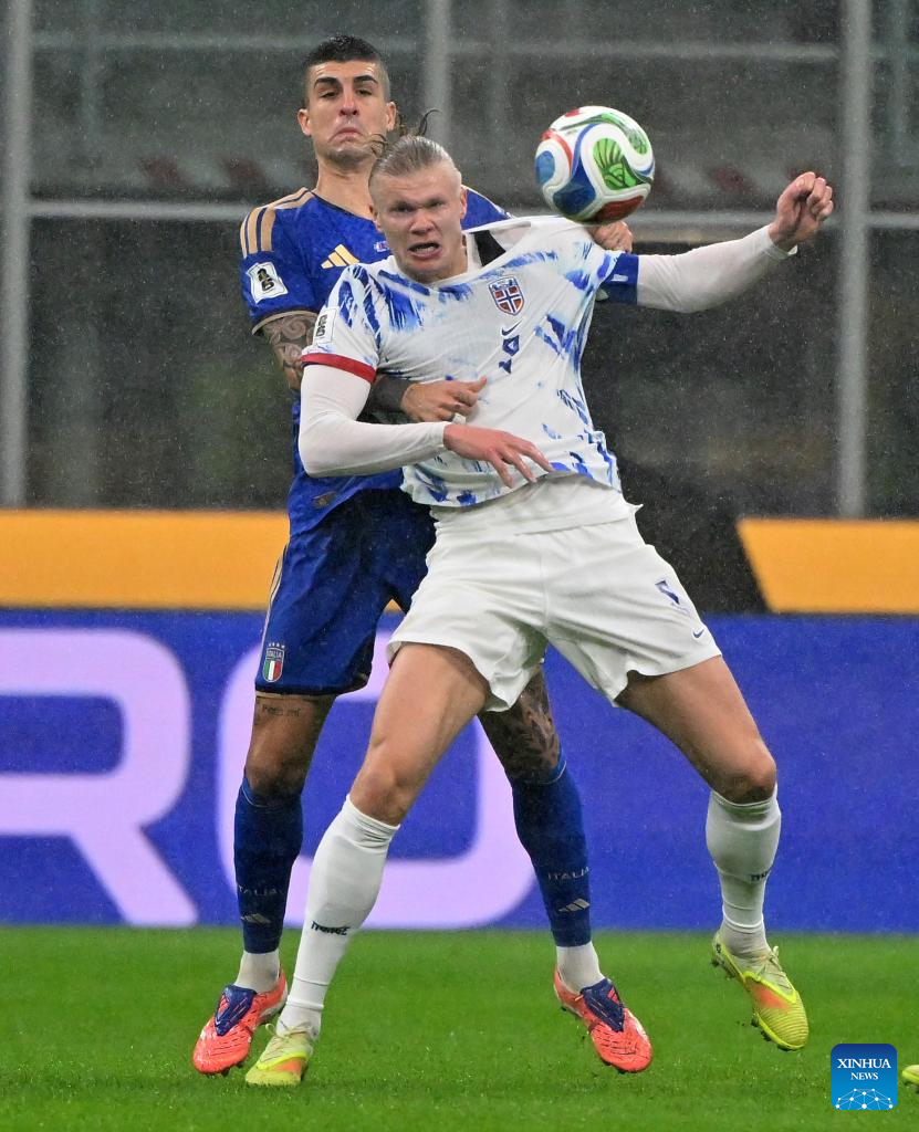 Gianluca Mancini (L) of Italy vies with Erling Haaland of Norway during the 2026 World Cup European Qualifiers match between Italy and Norway in Milan, Italy, Nov. 16, 2025. (Photo by Alberto Lingria/Xinhua)
