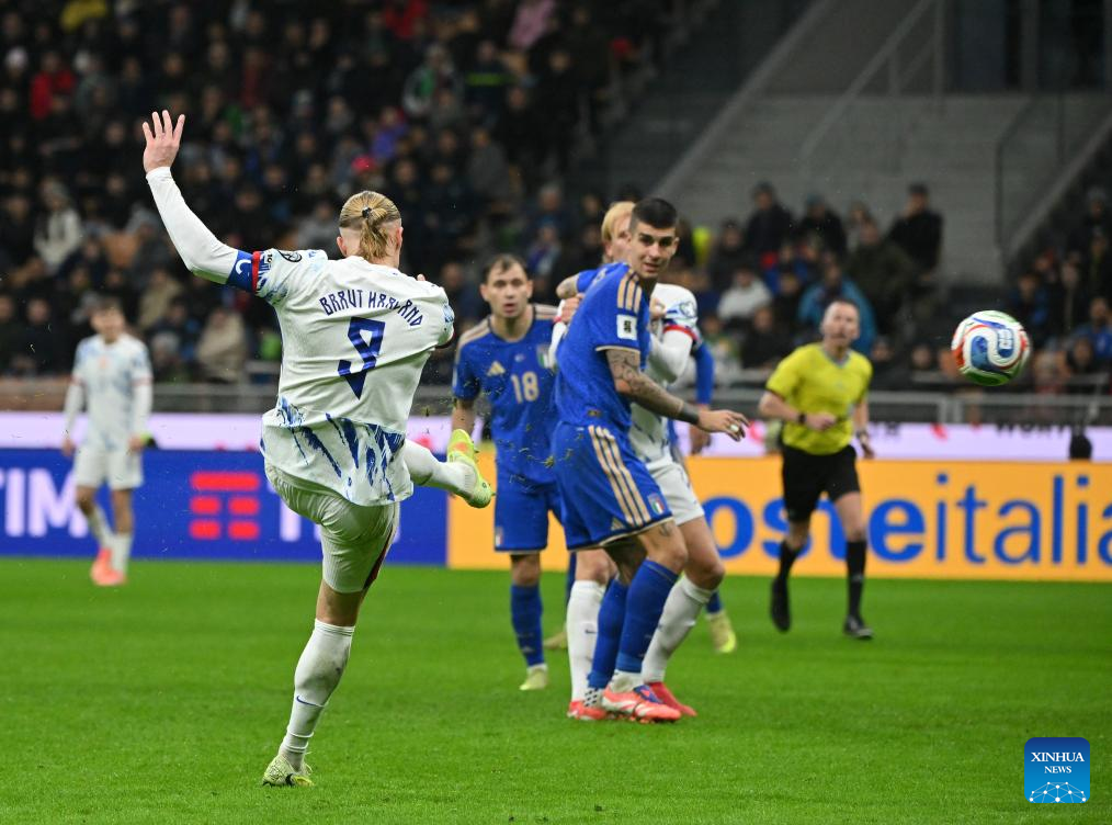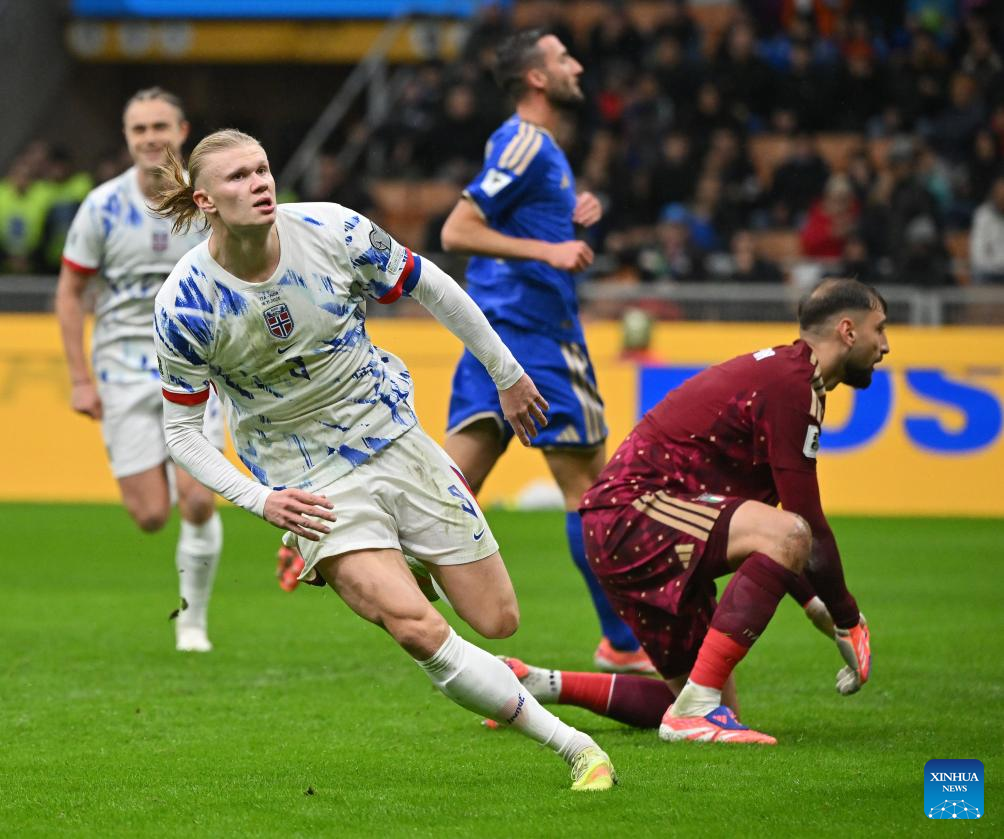 Erling Haaland (L) of Norway scores during the 2026 World Cup European Qualifiers match between Italy and Norway in Milan, Italy, Nov. 16, 2025. (Photo by Alberto Lingria/Xinhua)