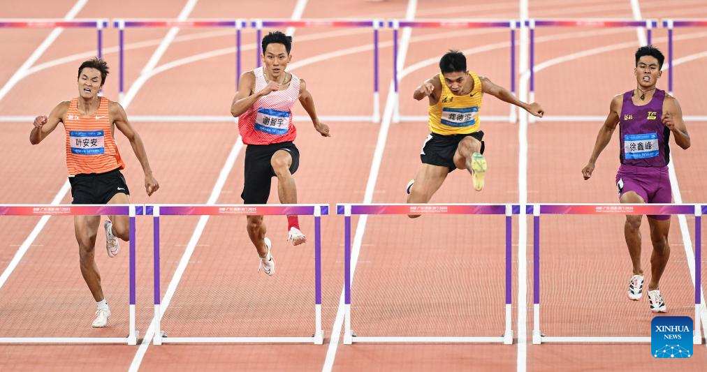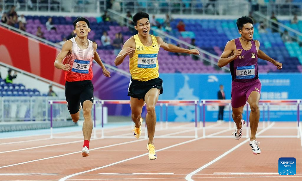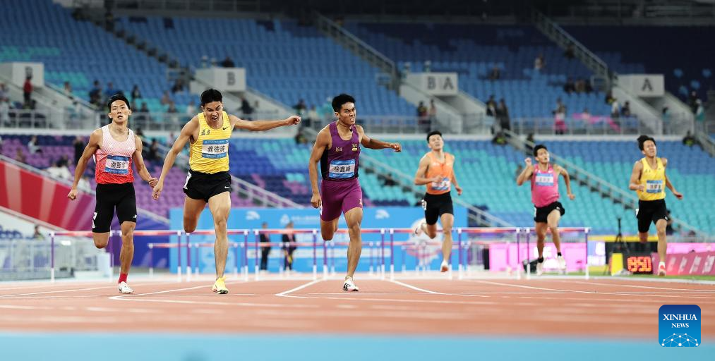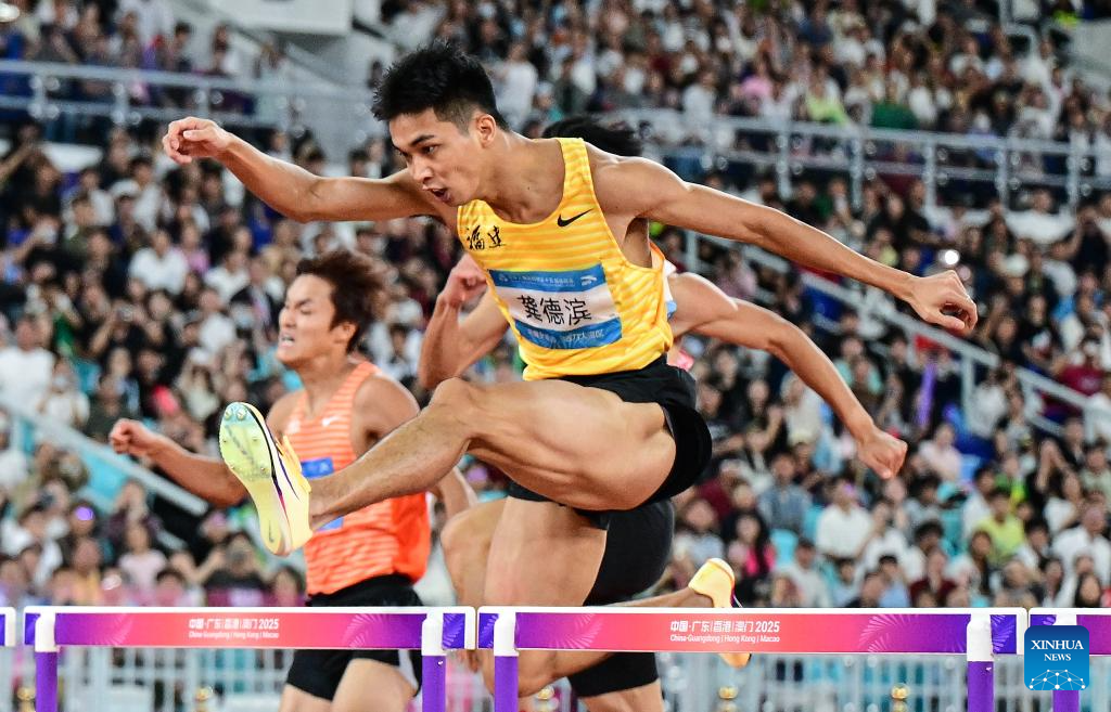 Gong Debin (C) of Fujian competes during the men's 400m hurdles final of athletics in Guangzhou, south China's Guangdong Province, Nov. 17, 2025. (Xinhua/Huang Wei)