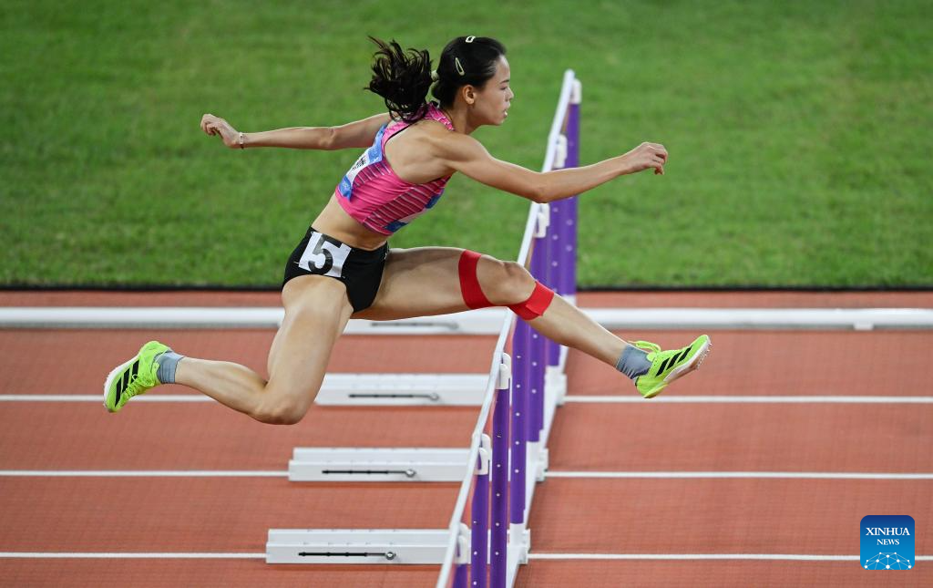 Mo Jiadie of Guangdong competes during the women's 400m hurdles final of athletics at China's 15th National Games in Guangzhou, south China's Guangdong Province, Nov. 17, 2025. (Xinhua/Jiang Han)