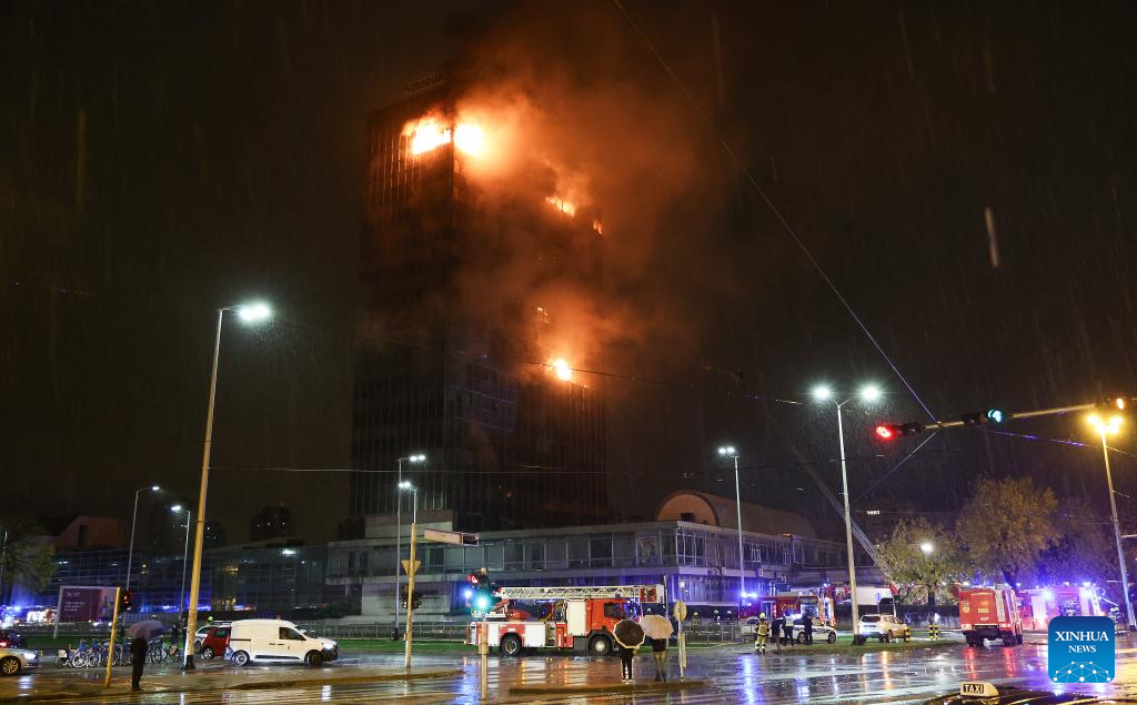 Firefighters work to extinguish the fire of the Vjesnik skyscraper in Zagreb, Croatia, Nov. 18, 2025 . One of the tallest buildings in Croatia caught fire shortly before midnight on Monday and continues to burn Tuesday morning, local media reported. (Matija Habljak/PIXSELL via Xinhua)