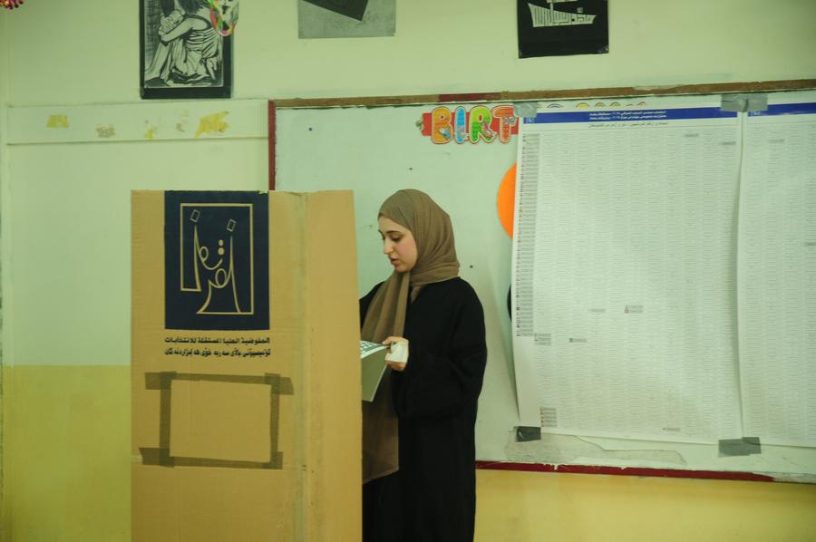 A woman votes at a polling center in Baghdad, Iraq, Nov. 11, 2025. (Xinhua/Duan Minfu)