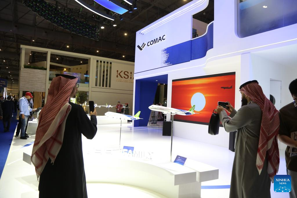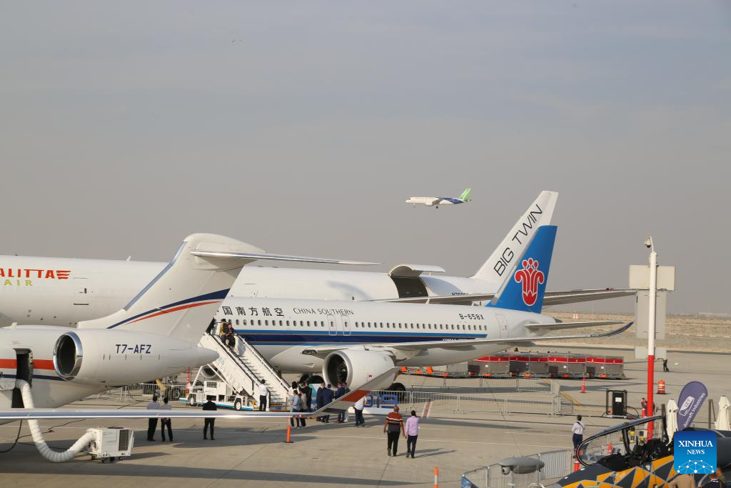 The Commercial Aircraft Corporation of China (COMAC), maker of the C919, is showcasing one C919 and one C909 aircraft, while China Southern Airlines has brought another C919. The appearance of the C919 marks its first showing in the Middle East, and COMAC performed a flight demonstration of the China-made passenger plane at the venue. (Xinhua/Wen Xinnian)