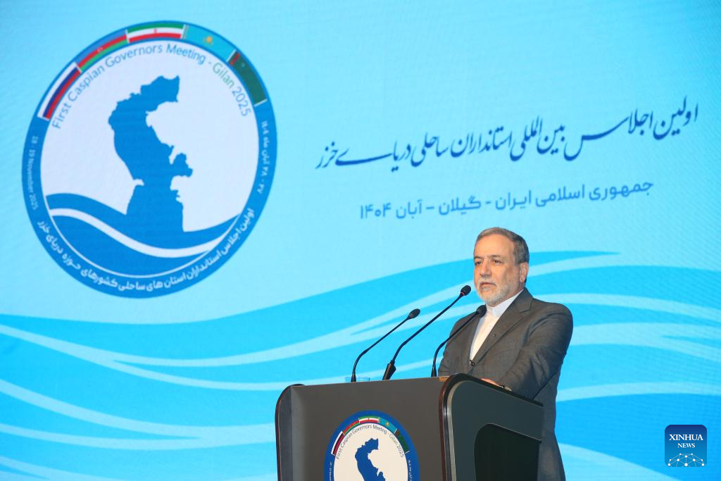 Iranian Foreign Minister Seyed Abbas Araghchi speaks during the opening ceremony of the First Caspian Governors' Forum in the northern city of Rasht, Iran, Nov. 18, 2025. Iran on Tuesday opened the First Caspian Governors' Forum in Rasht, aiming to strengthen regional cooperation among the Caspian Sea littoral states. (Xinhua/Shadati)