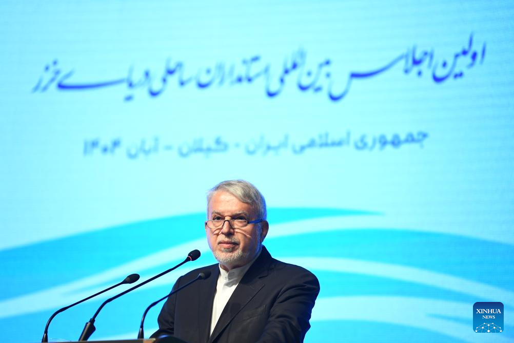 Iranian Cultural Heritage, Tourism and Handicrafts Minister Seyed Reza Salehi-Amiri speaks during the First Caspian Governors' Forum in the northern city of Rasht, Iran, Nov. 18, 2025. Iran on Tuesday opened the First Caspian Governors' Forum in Rasht, aiming to strengthen regional cooperation among the Caspian Sea littoral states. (Xinhua/Shadati)