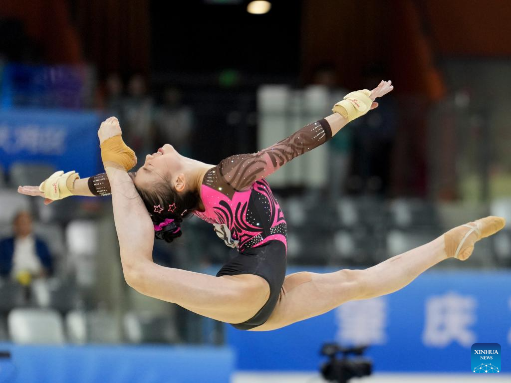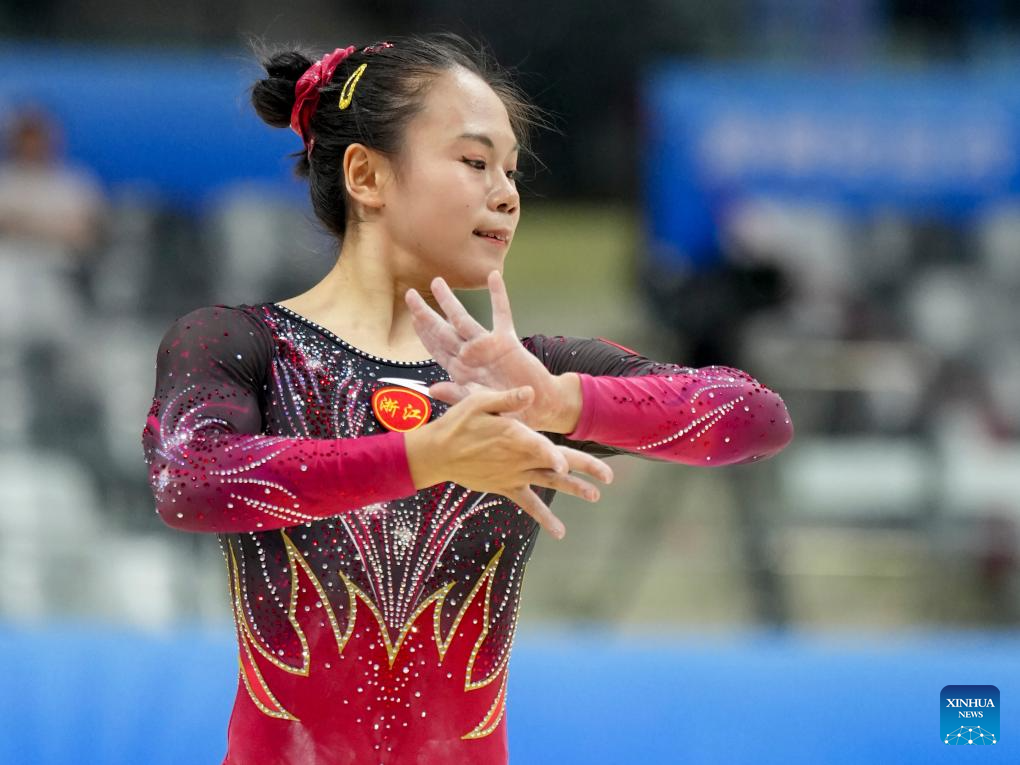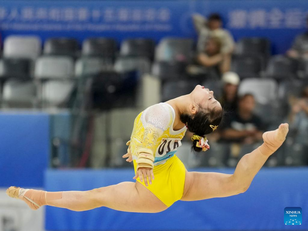 Yang Jingxi of Shandong competes during the artistic gymnastics women's floor exercise final at China's 15th National Games in Zhaoqing, south China's Guangdong Province, Nov. 17, 2025. (Xinhua/Xu Bingjie)