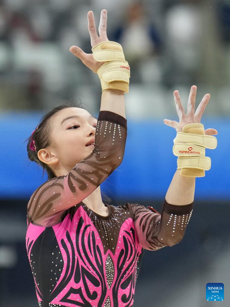 Zhang Qi of Hubei competes during the artistic gymnastics women's floor exercise final at China's 15th National Games in Zhaoqing, south China's Guangdong Province, Nov. 17, 2025. (Xinhua/Xu Bingjie)