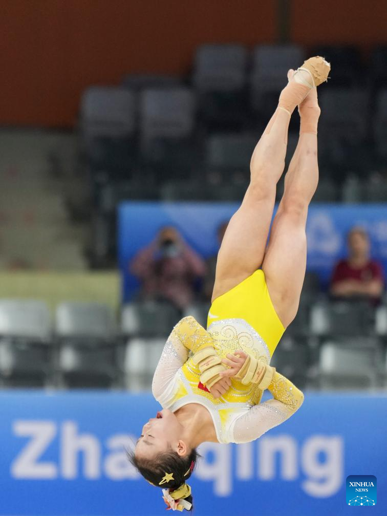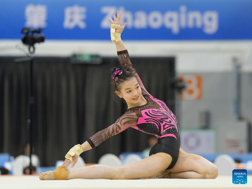 Zhang Qingying of Zhejiang competes during the artistic gymnastics women's floor exercise final at China's 15th National Games in Zhaoqing, south China's Guangdong Province, Nov. 17, 2025. (Xinhua/Xu Bingjie)