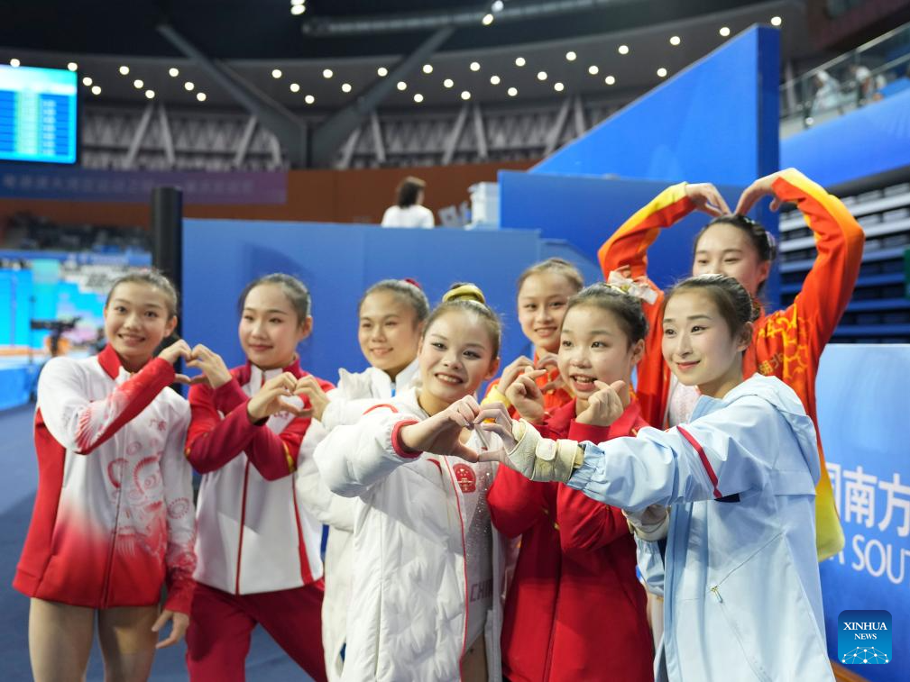 Contestants pose for photos after the artistic gymnastics women's floor exercise final at China's 15th National Games in Zhaoqing, south China's Guangdong Province, Nov. 17, 2025. (Xinhua/Xu Bingjie)