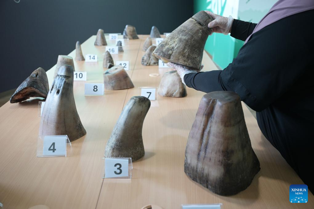 A staff member of National Parks Board (NParks) shows the 20 seized rhinoceros horns in Singapore's Centre for Wildlife Forensics on Nov. 18, 2025. Singapore has seized 20 pieces of rhinoceros horns weighing 35.7 kg at Changi Airport, the largest haul of its kind in the country to date, according to a joint statement issued Tuesday by the National Parks Board (NParks) and air cargo handler SATS. (Photo by Then Chih Wey/Xinhua)