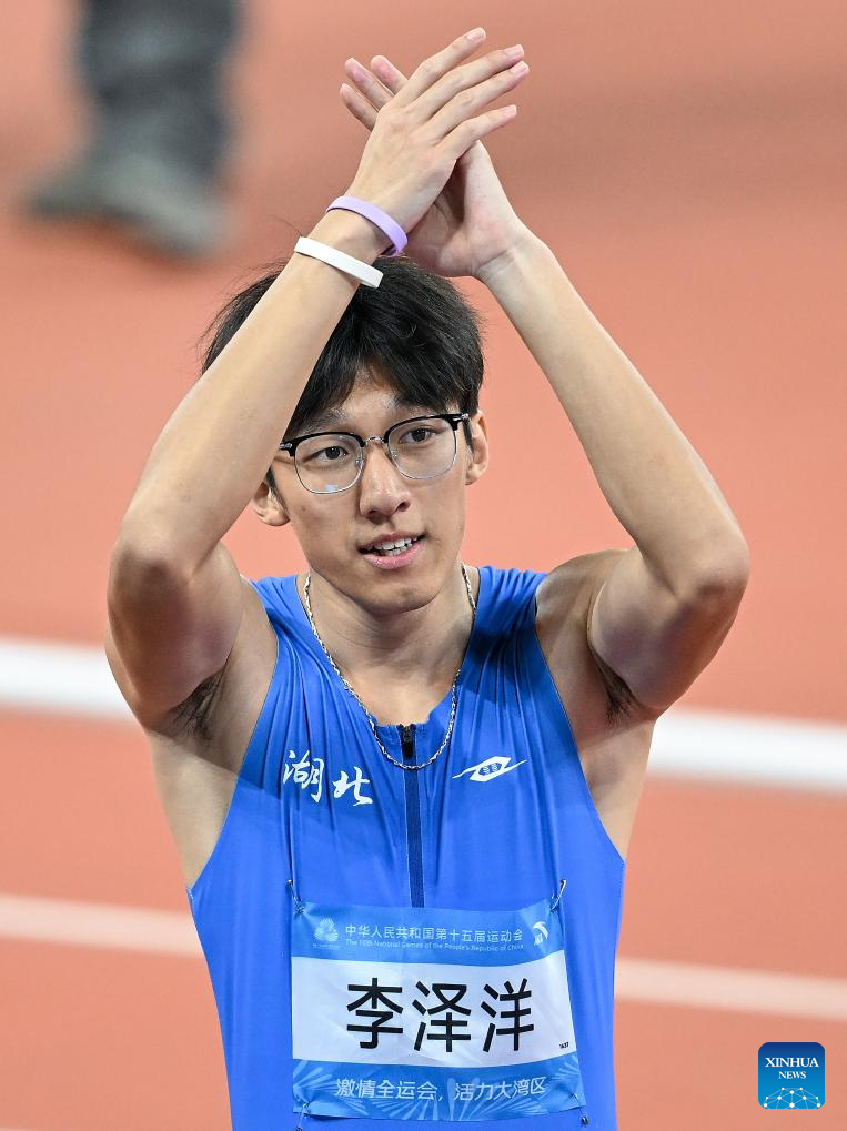 Li Zeyang of Hubei makes a bow to the spectators after the men's 100m final of athletics at China's 15th National Games in Guangzhou, south China's Guangdong Province, Nov. 17, 2025. (Xinhua/Zhou Mu)