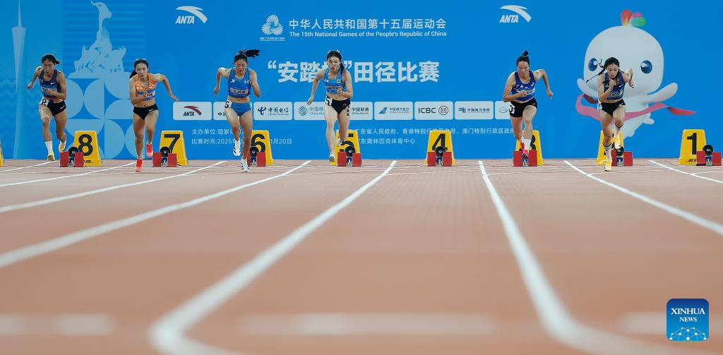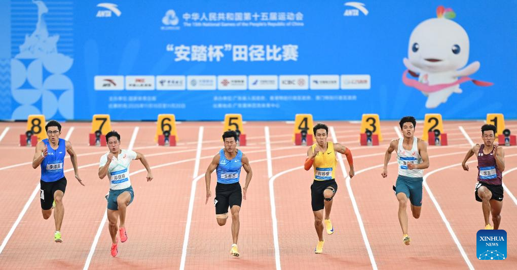 Athletes compete during the men's 100m final of athletics at China's 15th National Games in Guangzhou, south China's Guangdong Province, Nov. 17, 2025. (Xinhua/Huang Wei)