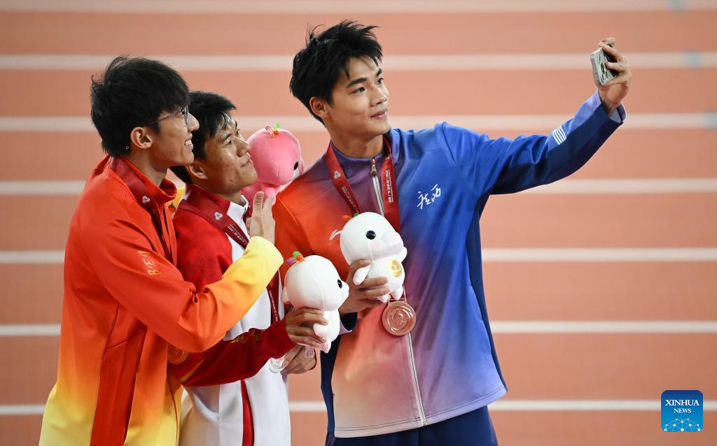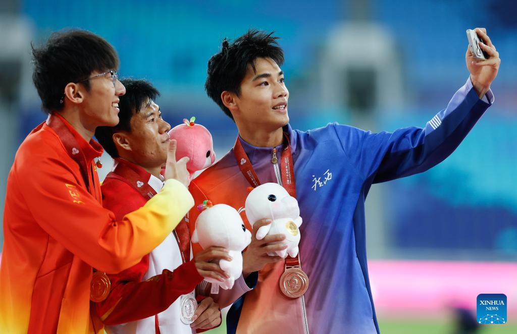 Gold medalist Li Zeyang of Hubei, silver medalist Wang Shengjie of Shandong and bronze medalist Zeng Keli of Guangxi pose for a selfie after the awarding ceremony for the men's 100m of athletics at China's 15th National Games in Guangzhou, south China's Guangdong Province, Nov. 17, 2025. (Xinhua/Xiao Yijiu)