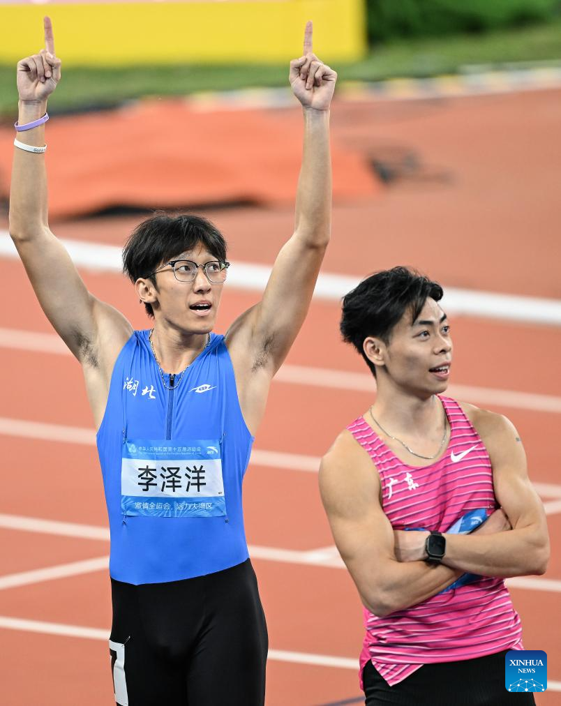Li Zeyang (R) of Hubei reacts after the men's 100m final of athletics at China's 15th National Games in Guangzhou, south China's Guangdong Province, Nov. 17, 2025. (Xinhua/Deng Hua)