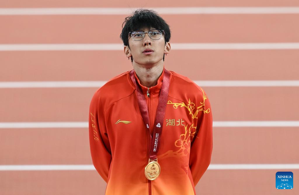 Gold medalist Li Zeyang of Hubei reacts during the awarding ceremony for the men's 100m of athletics at China's 15th National Games in Guangzhou, south China's Guangdong Province, Nov. 17, 2025. (Xinhua/Xiao Yijiu)