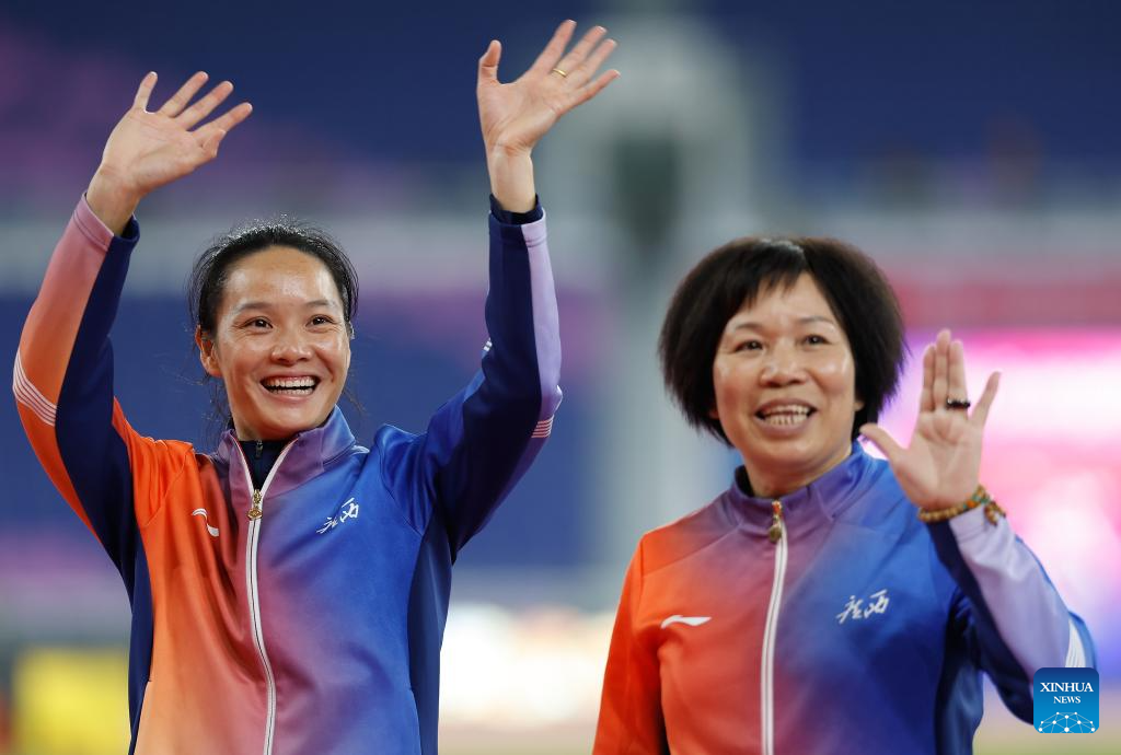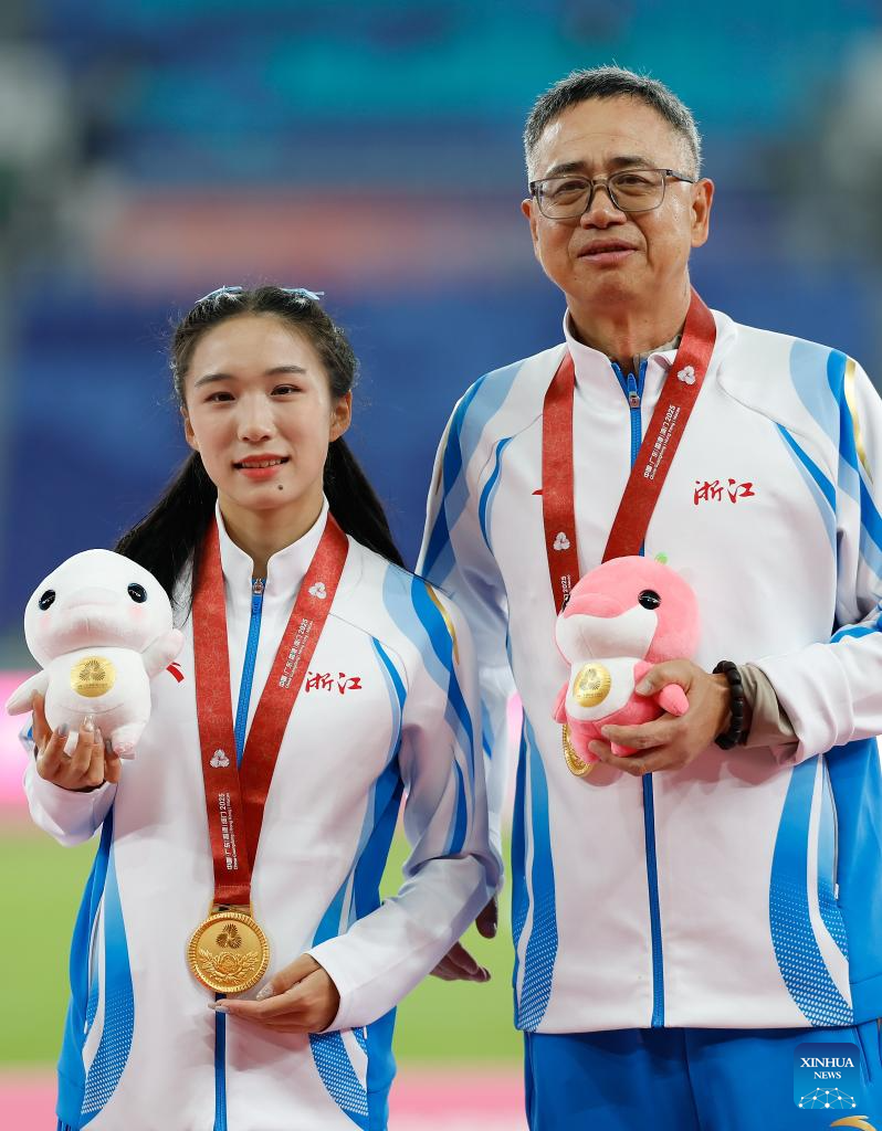 Gold medalist Chen Yujie of Zhejiang and her coach pose during the awarding ceremony of the women's 100m of athletics at China's 15th National Games in Guangzhou, south China's Guangdong Province, Nov. 17, 2025. (Xinhua/Huang Wei)