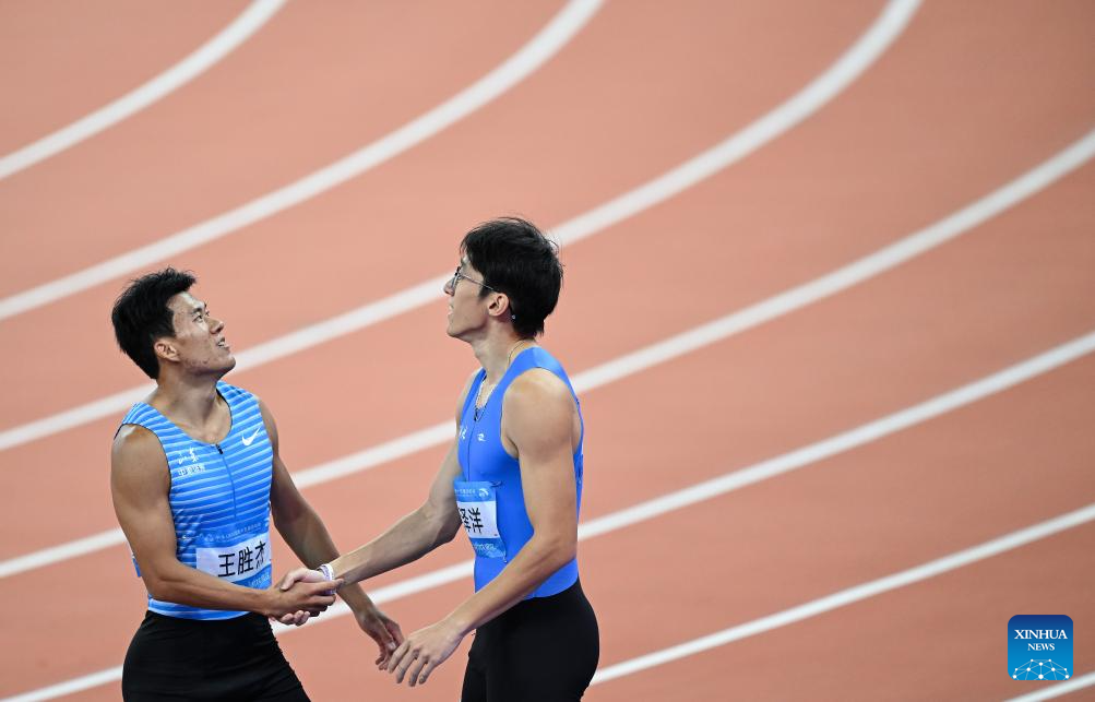 Li Zeyang (R) of Hubei greets Chen Guanfeng of Guangdong after the men's 100m final of athletics at China's 15th National Games in Guangzhou, south China's Guangdong Province, Nov. 17, 2025. (Xinhua/Jiang Han)