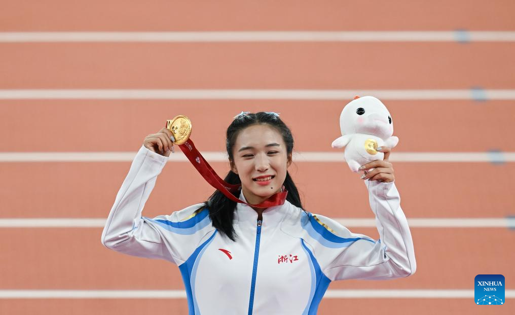 Gold medalist Chen Yujie of Zhejiang poses during the awarding ceremony of the women's 100m of athletics at China's 15th National Games in Guangzhou, south China's Guangdong Province, Nov. 17, 2025. (Xinhua/Xiao Yijiu)