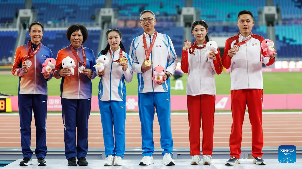 Gold medalist Chen Yujie of Zhejiang, silver medalist Wei Yongli of Guangxi and bronze medalist Shi Linqi of Anhui pose during the awarding ceremony of the women's 100m of athletics at China's 15th National Games in Guangzhou, south China's Guangdong Province, Nov. 17, 2025. (Xinhua/Huang Wei)