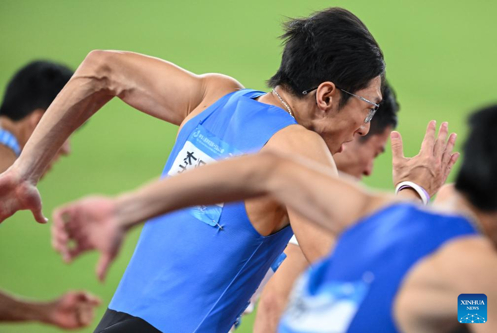 Athletes compete during the men's 100m final of athletics at China's 15th National Games in Guangzhou, south China's Guangdong Province, Nov. 17, 2025. (Xinhua/Deng Hua)