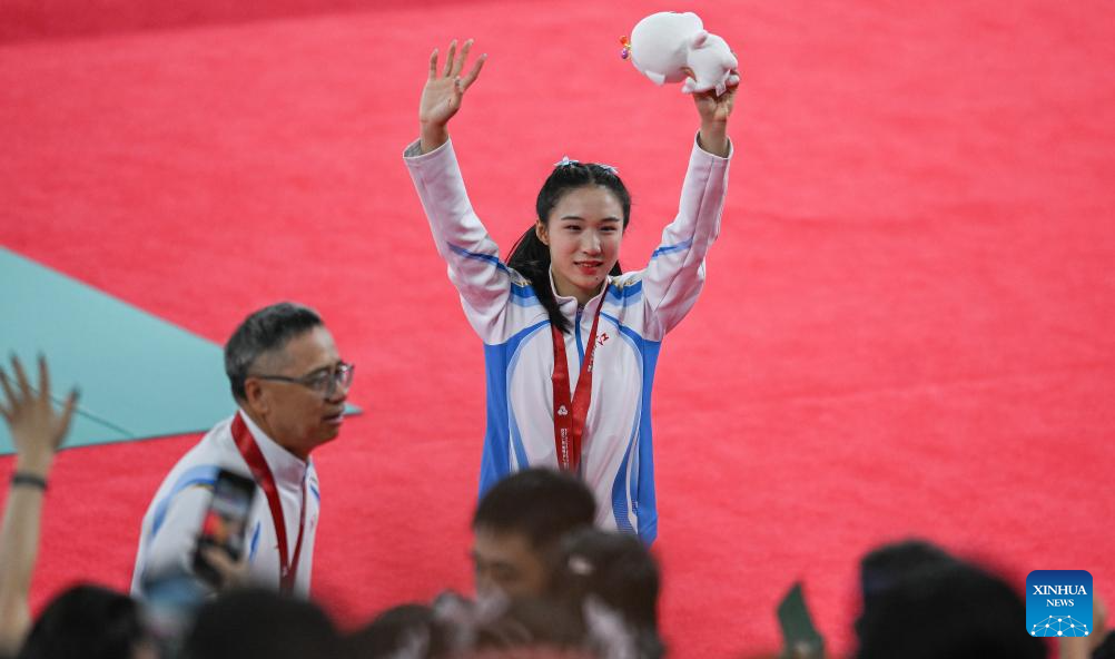 Gold medalist Chen Yujie of Zhejiang greets the spectators after the awarding ceremony of the women's 100m of athletics at China's 15th National Games in Guangzhou, south China's Guangdong Province, Nov. 17, 2025. (Xinhua/Zhou Mu)