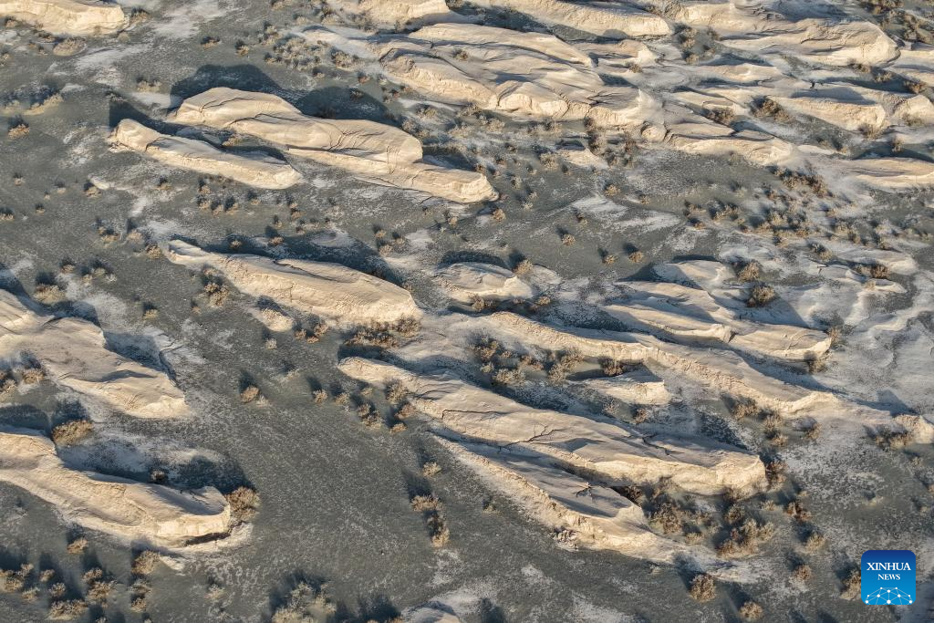 An aerial drone photo taken on Nov. 18, 2025 shows the remains of an irrigation canal system in Guazhou County, Jiuquan City, northwest China's Gansu Province. Located in the Gobi Desert to the southeast of today's Suoyang Town, the ruins of Suoyang City, which used to play a pivot role in boarder defense and transportation in the olden times, consist of the Suoyang City site, the Ta'er temple, remains of an irrigation canal system, and a group of tombs.