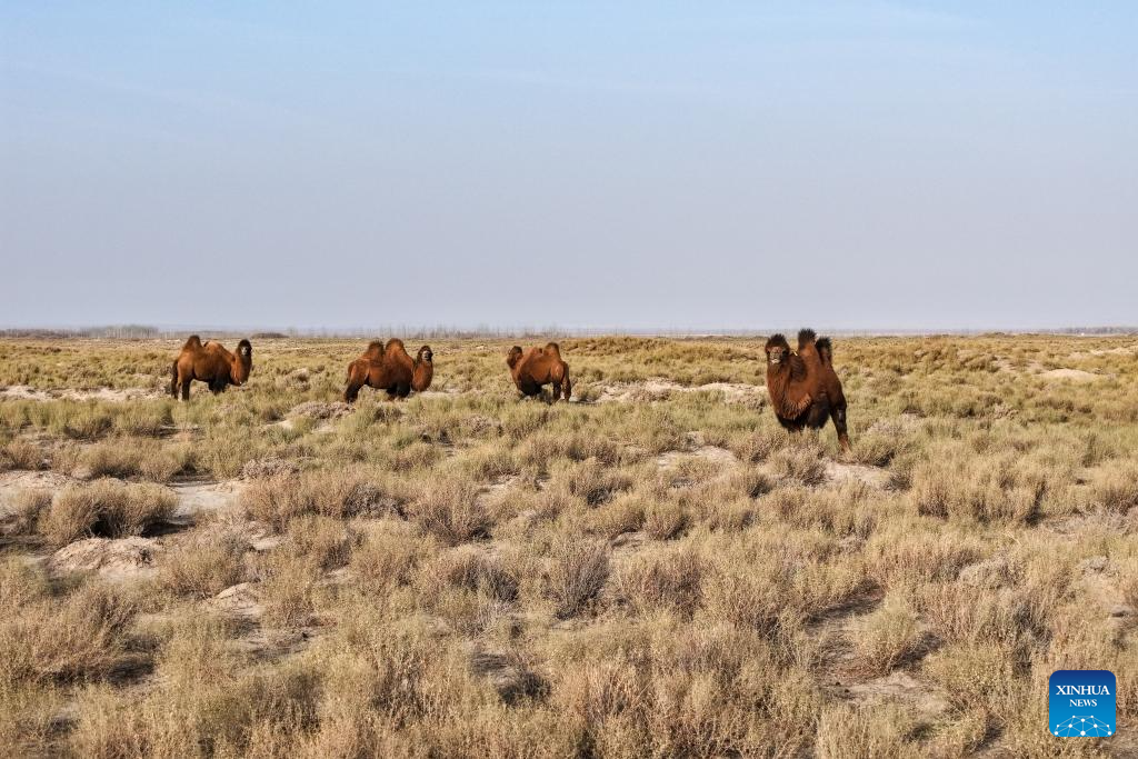 A drone photo taken on Nov. 18, 2025 shows a herd of camels foraging outside the ruins of Suoyang City in Guazhou County, Jiuquan City, northwest China's Gansu Province. Located in the Gobi Desert to the southeast of today's Suoyang Town, the ruins of Suoyang City, which used to play a pivot role in boarder defense and transportation in the olden times, consist of the Suoyang City site, the Ta'er temple, remains of an irrigation canal system, and a group of tombs.