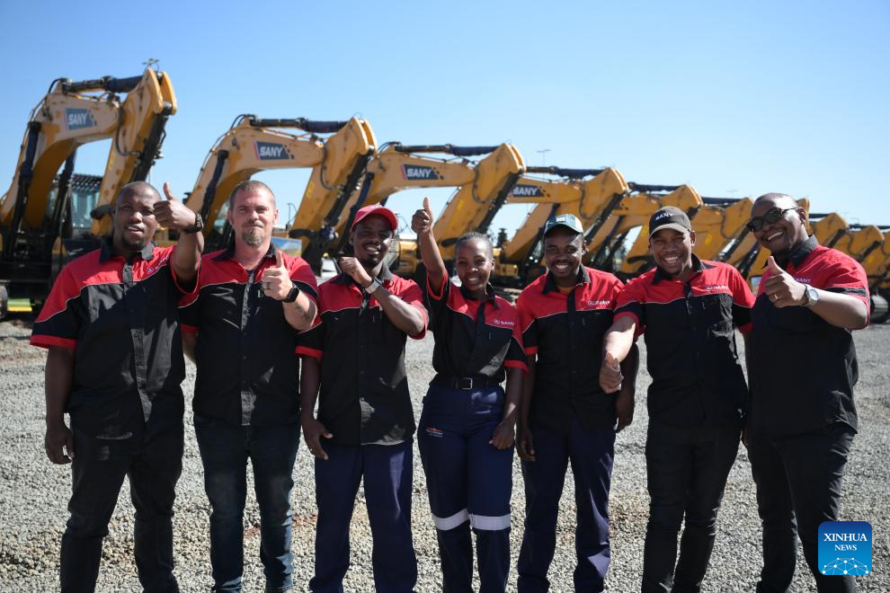 Local employees pose for a photo in front of SANY excavators in Johannesburg, South Africa, on Nov. 19, 2025. China's leading heavy equipment manufacturer SANY on Wednesday commissioned a new industrial park in Johannesburg, strengthening its support for the country's industrialization drive. (Xinhua/Yang Guang)