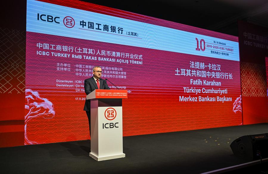 ISTANBUL, Nov. 18 (Xinhua) -- Türkiye's first renminbi (RMB) clearing bank -- operated by the Turkish branch of the Industrial and Commercial Bank of China, ICBC Türkiye -- was officially launched in Istanbul on Monday, marking a new milestone in China-Türkiye financial cooperation and further promoting the use of local currencies in bilateral trade and investment.