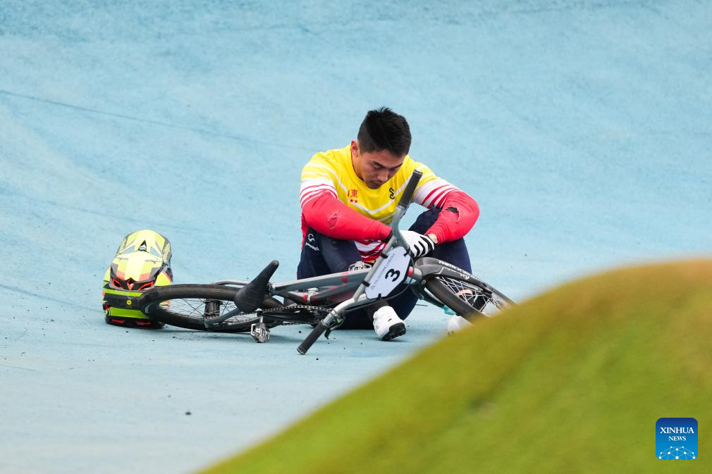 Miao Runpeng of Shandong falls down during the men's final of cycling BMX racing at China's 15th National Games in Shenzhen, south China's Guangdong Province, Nov. 19, 2025. (Xinhua/Chen Sihan)