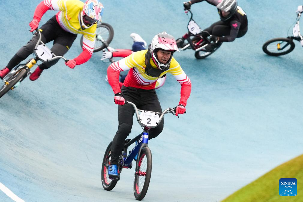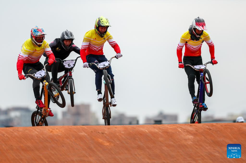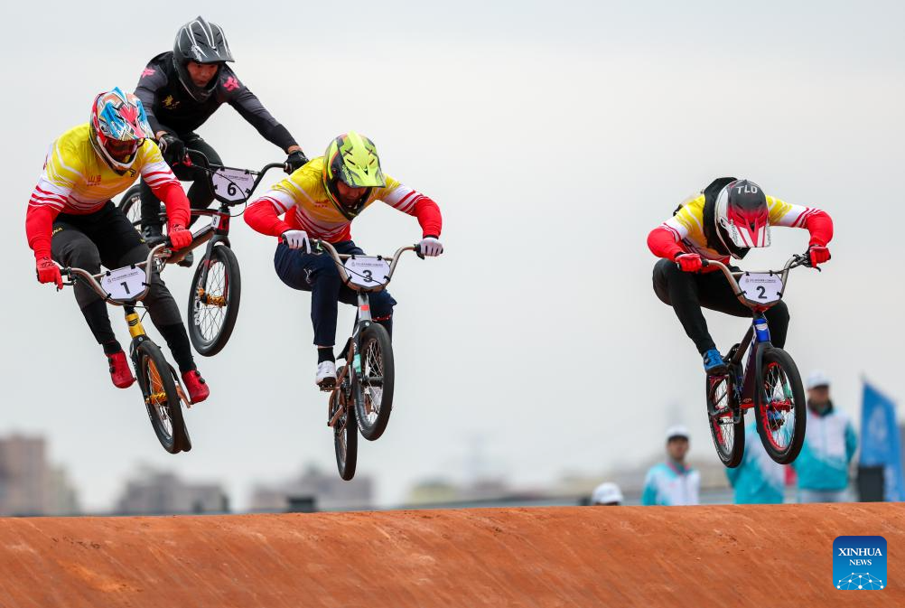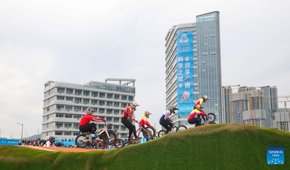 Racers compete during the men's final of cycling BMX racing at China's 15th National Games in Shenzhen, south China's Guangdong Province, Nov. 19, 2025. (Xinhua/Mao Siqian)