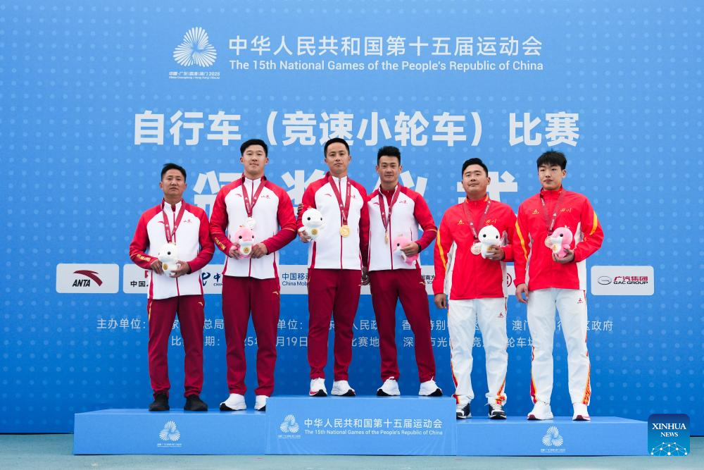 Gold medalist Lin Haochao of Shandong, silver medalist Chen Yucheng of Shandong, and bronze medalist Chu Chenfuxuan of Sichuan pose with their coaches during the awarding ceremony for men's cycling BMX racing at China's 15th National Games in Shenzhen, south China's Guangdong Province, Nov. 19, 2025. (Xinhua/Chen Sihan)
