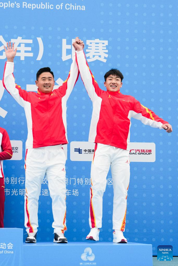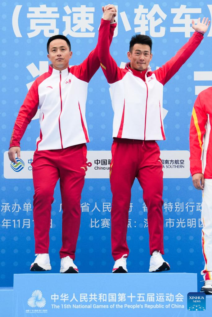 Gold medalist Lin Haochao of Shandong and his coach wave during the awarding ceremony for men's cycling BMX racing at China's 15th National Games in Shenzhen, south China's Guangdong Province, Nov. 19, 2025. (Xinhua/Chen Sihan)
