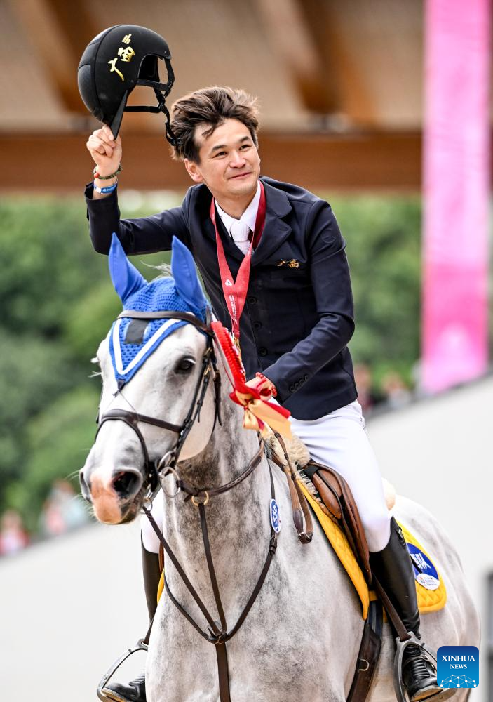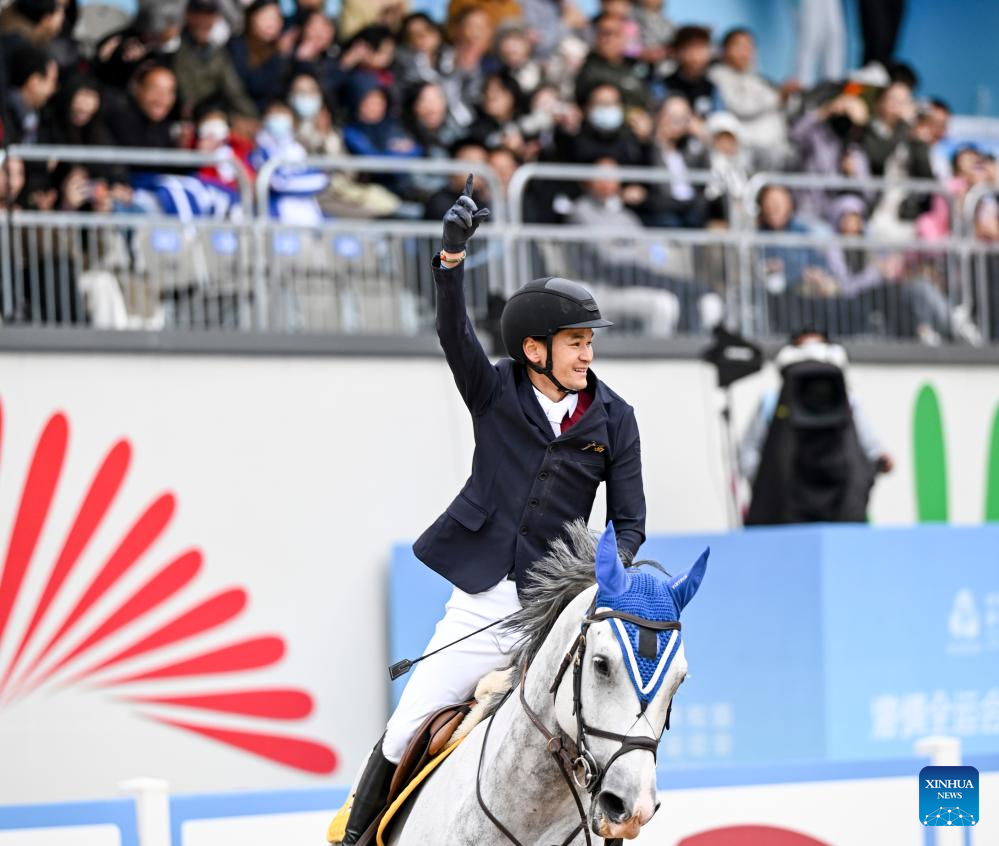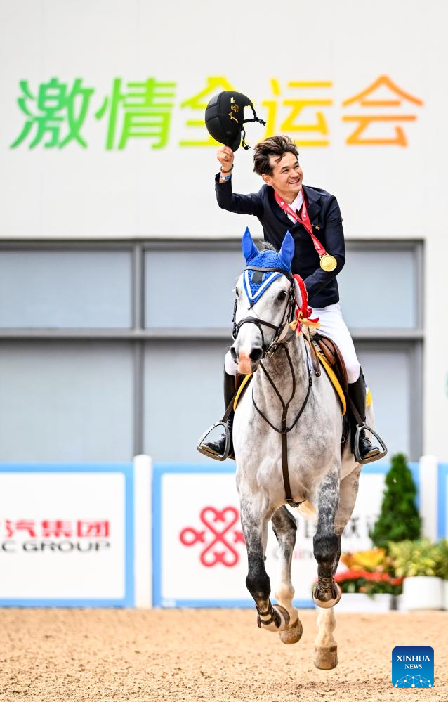 Muladeli of Guangxi celebrates after the jumping individual final of equestrian at China's 15th National Games in Shenzhen, south China's Guangdong Province, Nov. 19, 2025. (Xinhua/Feng Kaihua)
