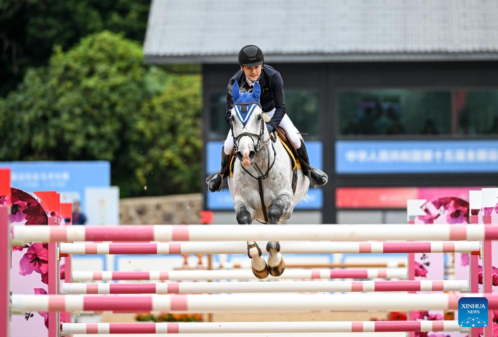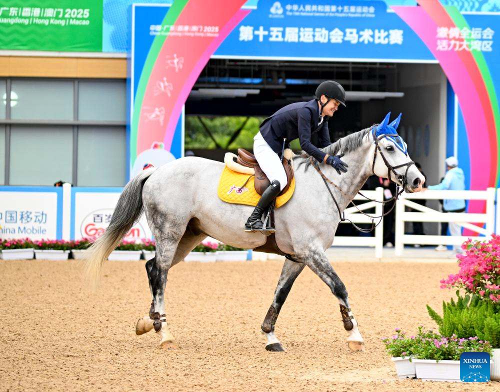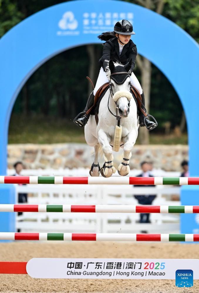 Wang Yunjing of Hebei competes during the jumping individual final of equestrian at China's 15th National Games in Shenzhen, south China's Guangdong Province, Nov. 19, 2025. (Xinhua/Feng Kaihua)
