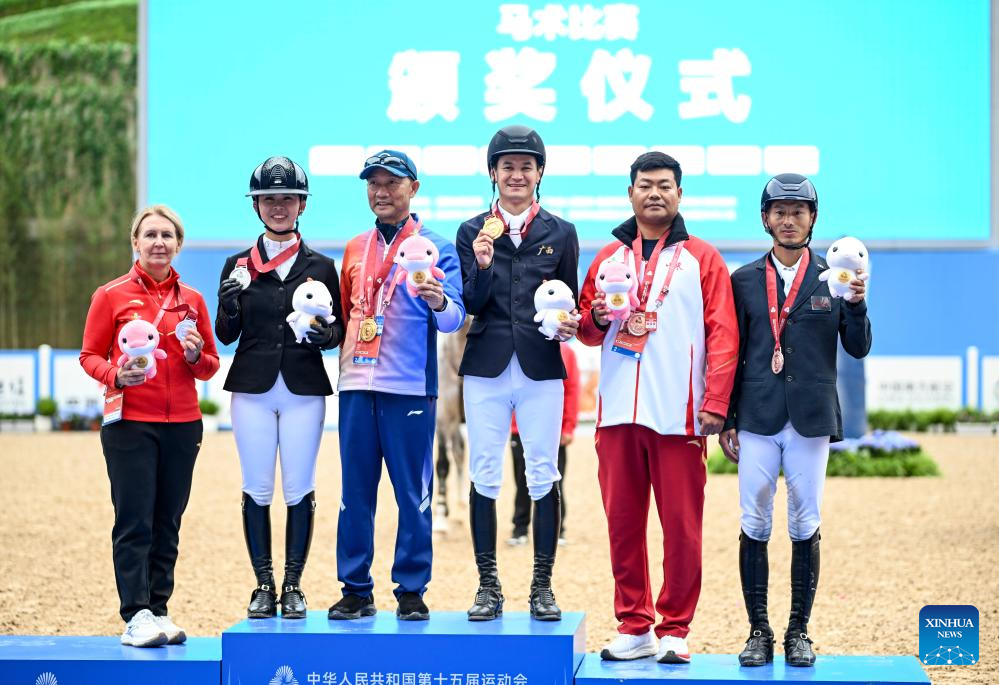 Gold medalist Muladeli (3rd R) of Guangxi, silver medalist Wang Yunjing (2nd L) of Hebei, Zhang Yong (1st R) of Shandong pose during the awarding ceremony for the jumping individual of equestrian at China's 15th National Games in Shenzhen, south China's Guangdong Province, Nov. 19, 2025. (Xinhua/Feng Kaihua)