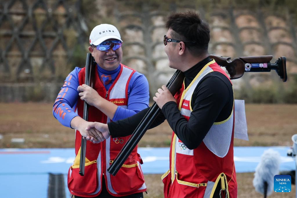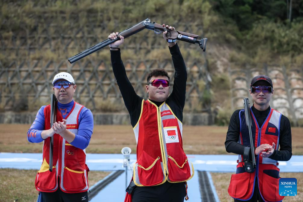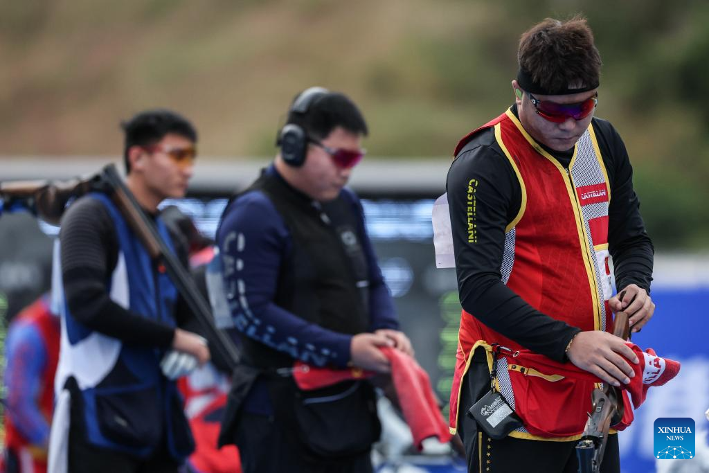 Qi Ying (R) of Shandong is seen during the trap men's final of shooting at China's 15th National Games in Guangzhou, south China's Guangdong Province, Nov. 19, 2025. (Xinhua/Pan Yulong)