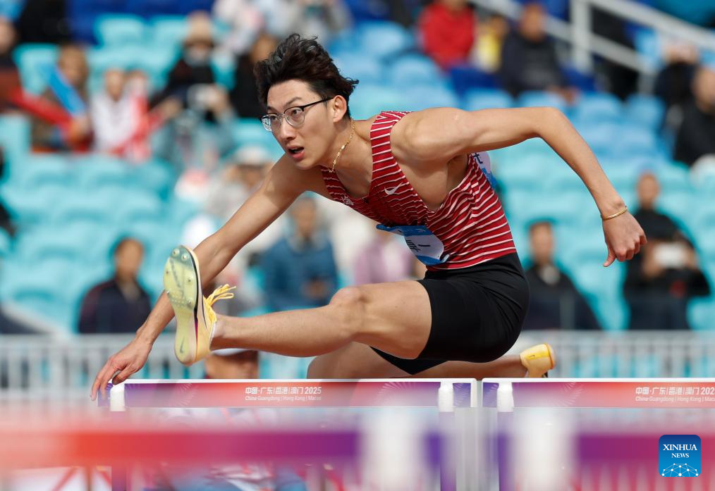 Xu Zhuoyi of Shanghai competes during the men's 110m hurdles heat of athletics at China's 15th National Games in Guangzhou, south China's Guangdong Province, Nov. 19, 2025. (Xinhua/Huang Wei)