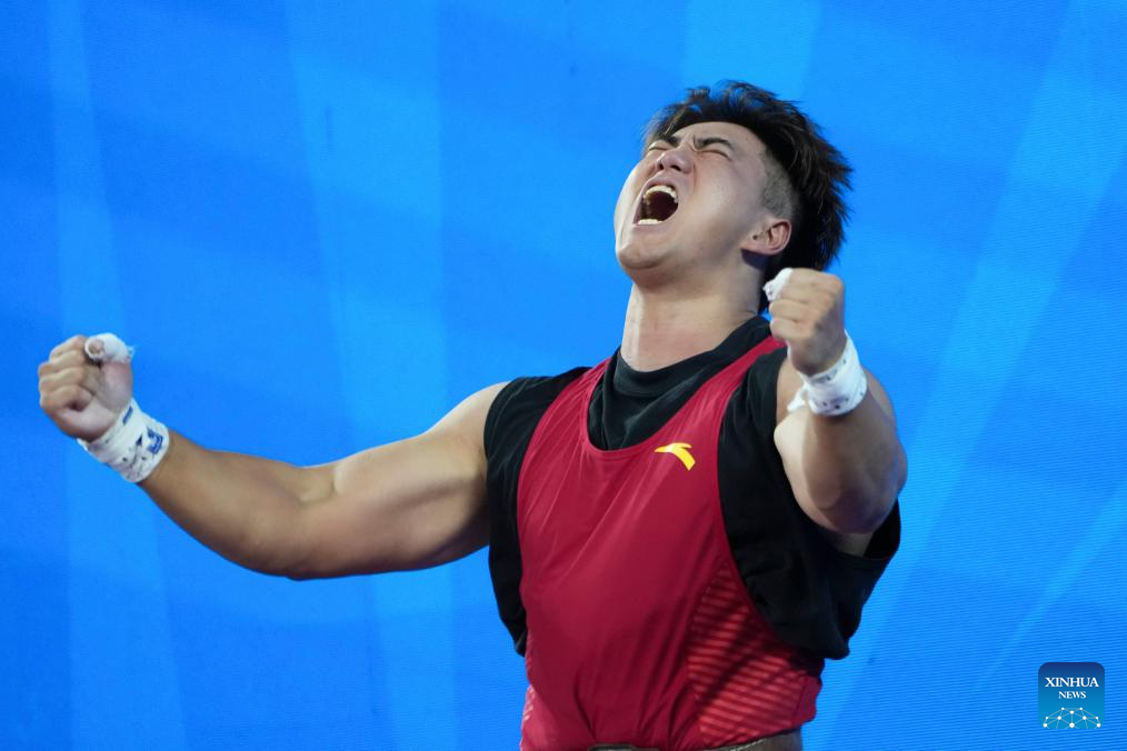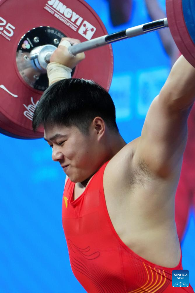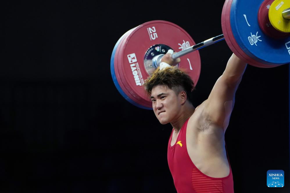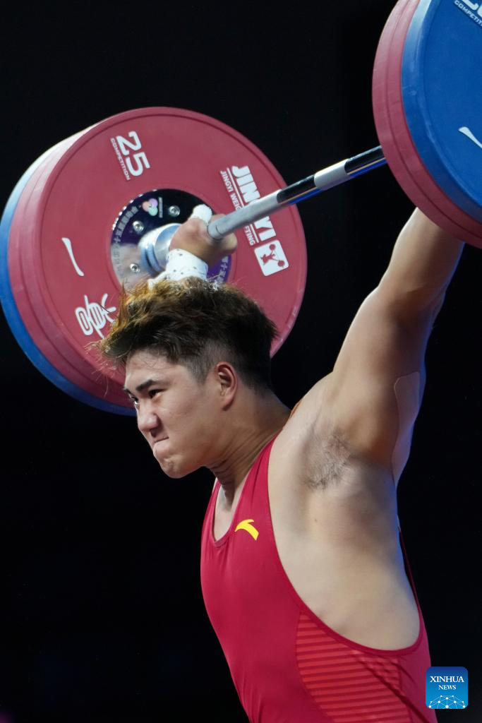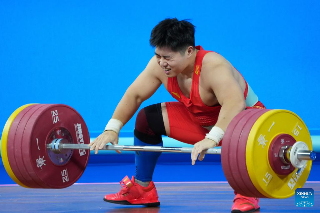 Gold medalist Qian Feixiang of Jiangsu competes in snatch during the weightlifting men's 96kg final at China's 15th National Games in Dongguan, south China's Guangdong Province, Nov. 19, 2025. (Xinhua/Yang Chenguang)